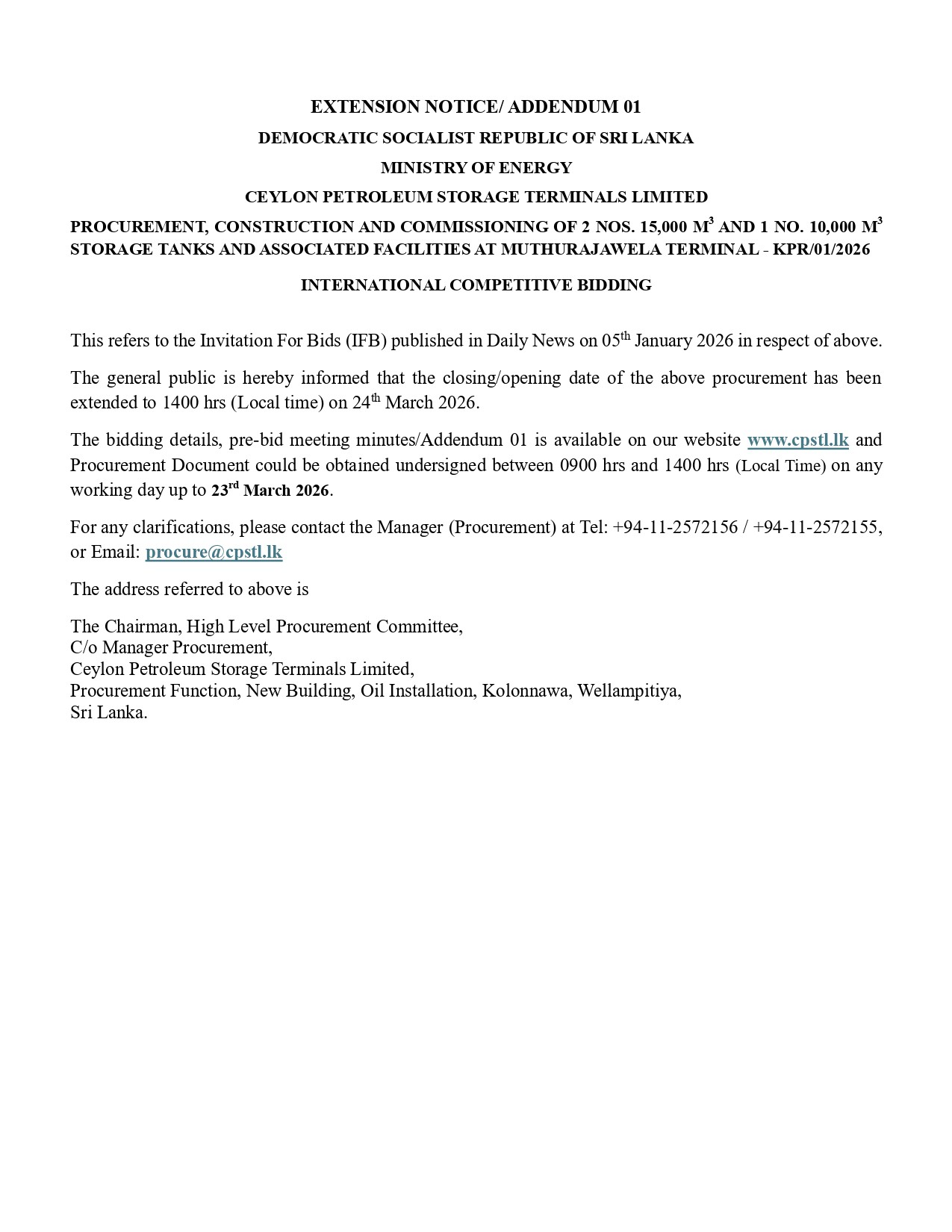 Addendum Notice - Ceylon Petroleum Storage Terminals Limited Procurement, Construction and Commissioning of 2 Nos. 15,000 m3 and 1 No. 10,000 m3 Storage Tanks and Associated Facilities at Muthurajawela