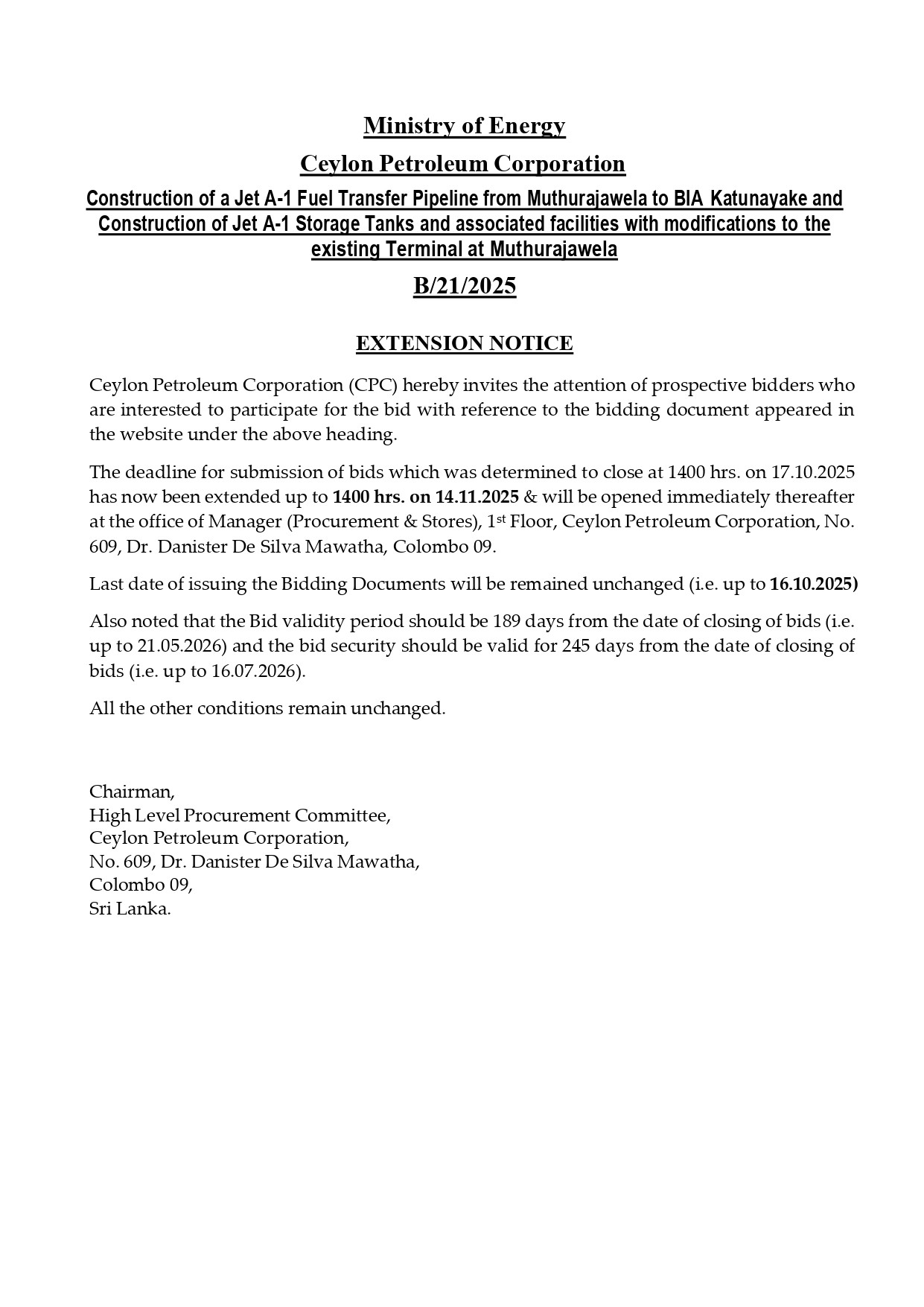 Extension Notice - Ministry of Energy Construction of A jet A-1 Transfer Pipeline from Muthurajawela to BIA Katunayake and Construction of Jet A-1 Storage Tanks and Associated Facilities with Modifications to the Existing Terminal Facility