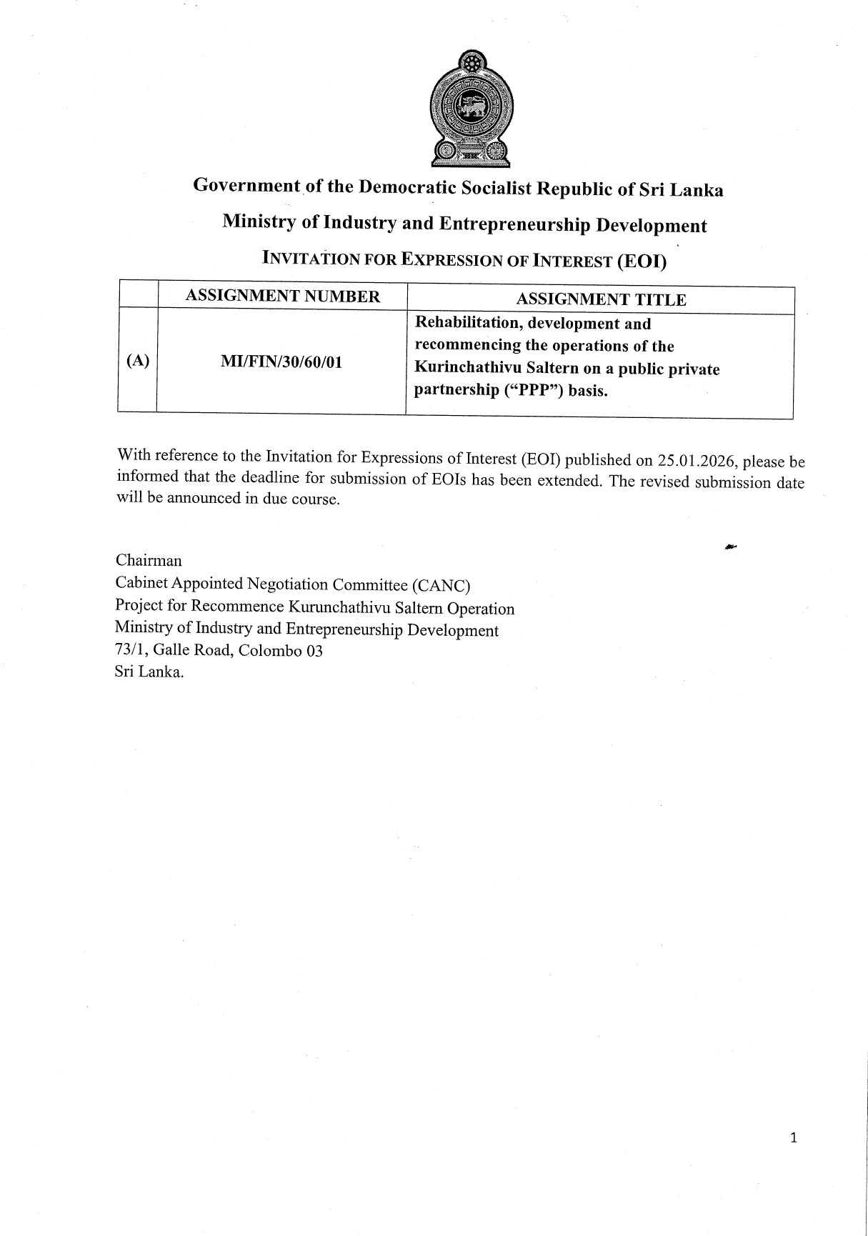 Extension Notice - Ministry of Industry and Entrepreneurship Development Rehabilitation, Development and Recommencing the Operations of the Kurinchathivu Saltern on a Public Private Partnership ("PPP") basis Assignment