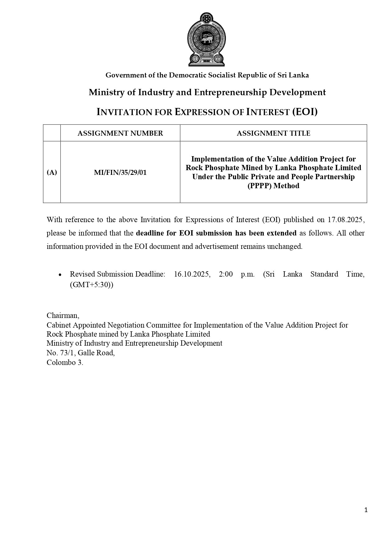 Extension Notice - Ministry of Industry and Entrepreneurship Development Implementation of the Value Addition Project for Rock Phosphate Mined by Lanka Phosphate Limited under the Public Private and People Partnership (PPPP) Method Assignment