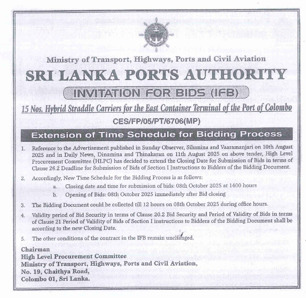 Extension of Time Schedule for Bidding Process – Sri Lanka Ports Authority Procurement of 15 nos. Hybrid Straddle Carriers for the East Container Terminal of the Port of Colombo Procurement No.: CES/EP/05/PT/6706 (MP)