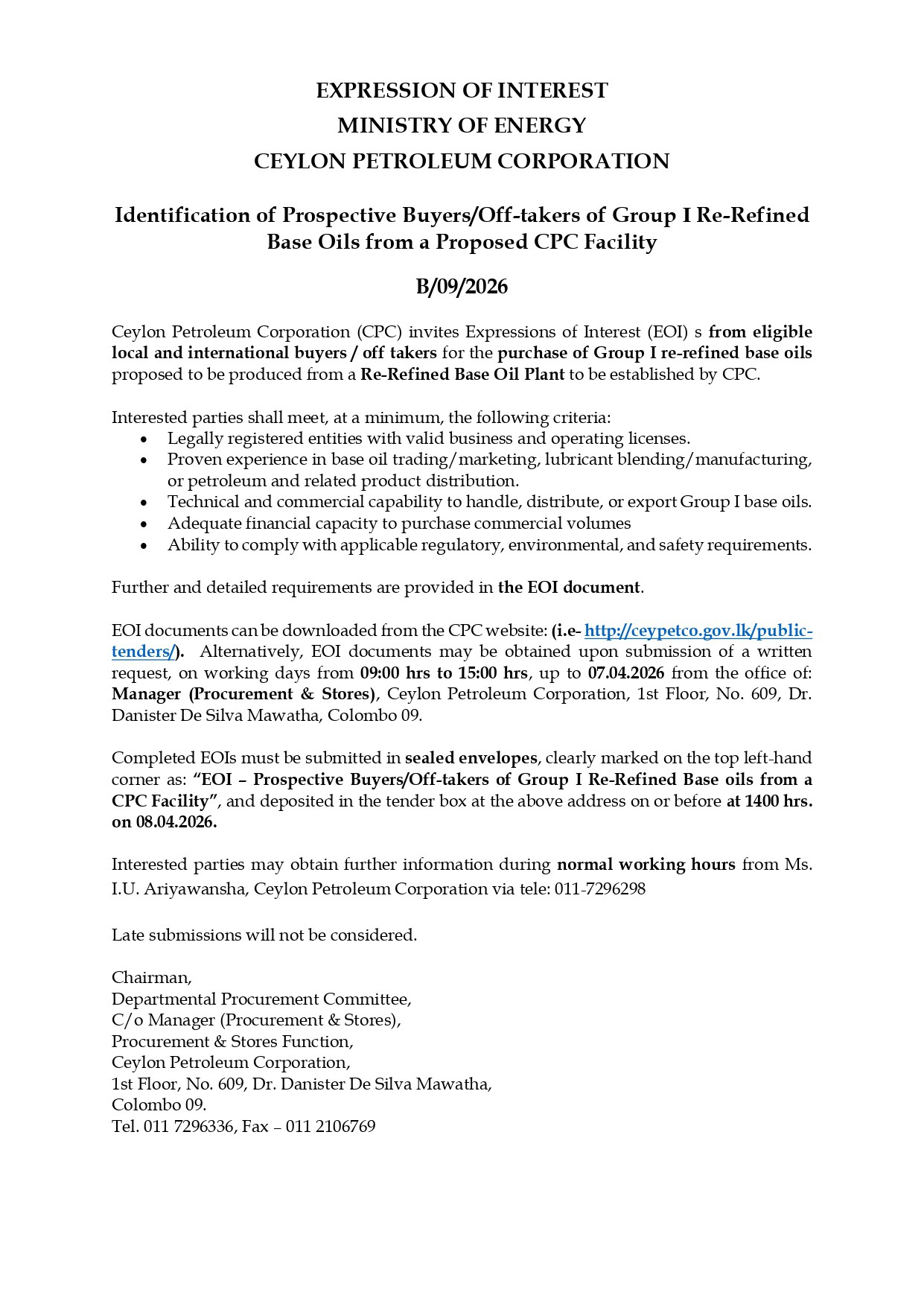 31.03.2026 - 16:22 Invitation for Bids (IFB) - Ceylon Petroleum Corporation Identification of Prospective Buyers/Off-takers of Group I Re-Refined Base Oils From a Proposed CPC Facility Bid Reference No.: B/09/2026