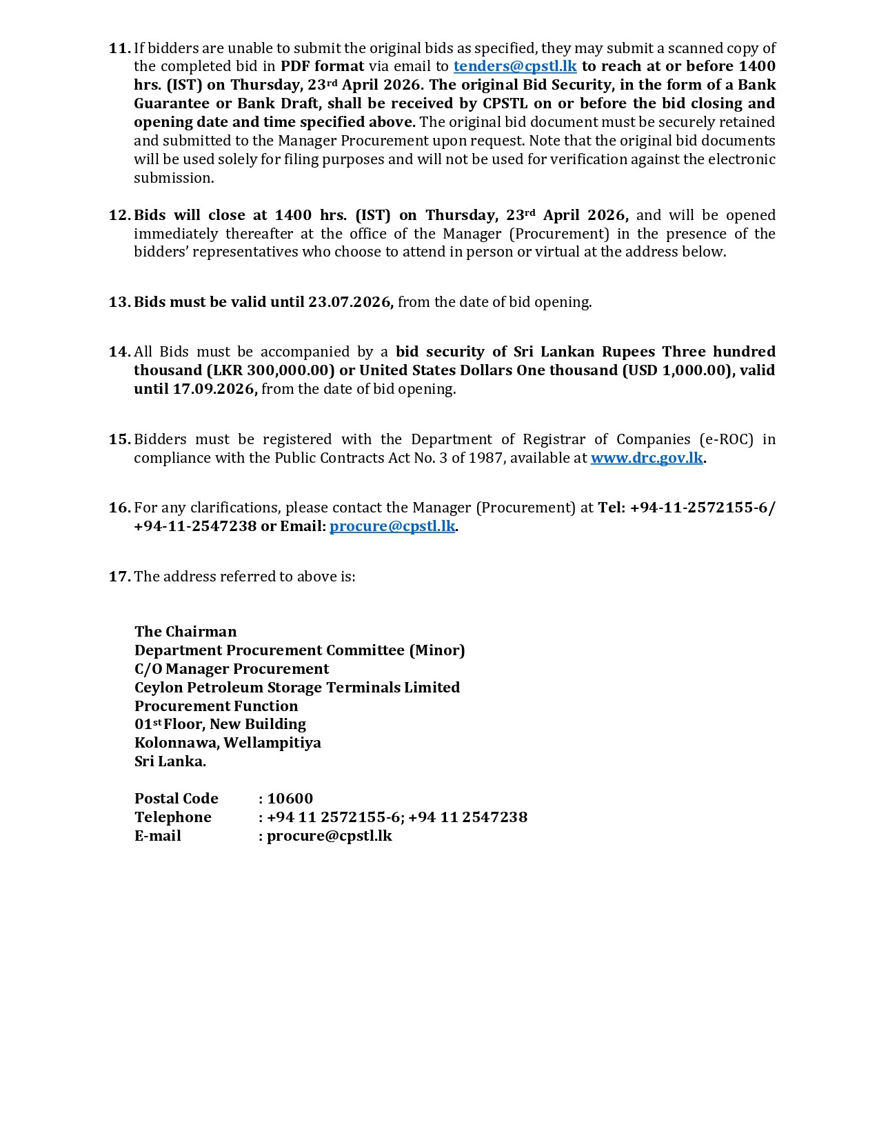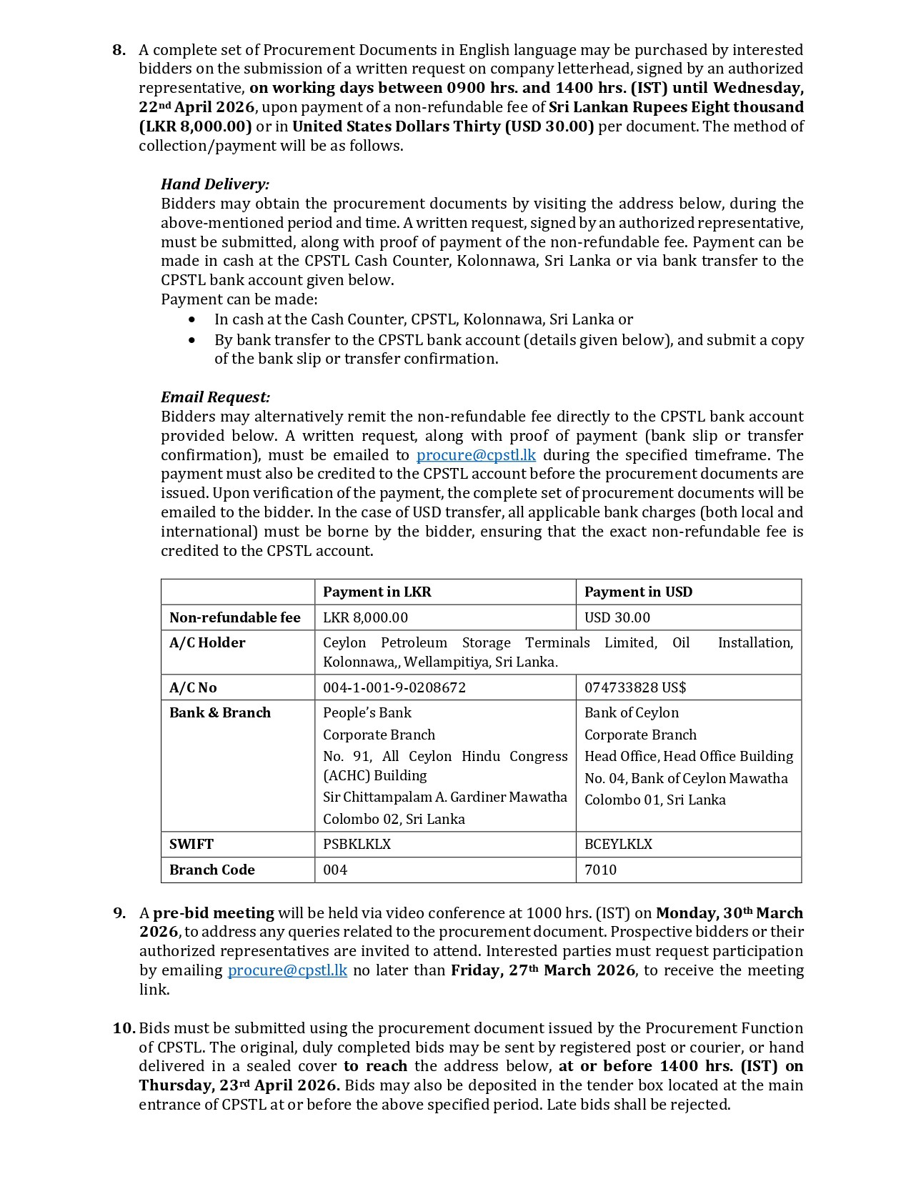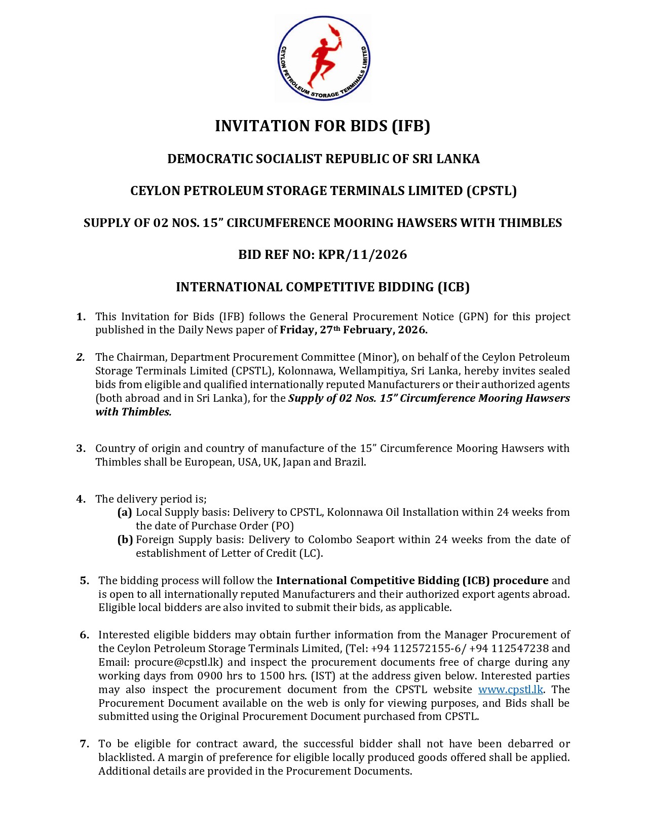 Invitation for Bids (IFB) - Ceylon Petroleum Storage Terminals Limited (CPSTL) Supply of 02 Nos. 15" Circumference Mooring Hawsers with Thimbles Bid Ref. No. KPR/11/2026