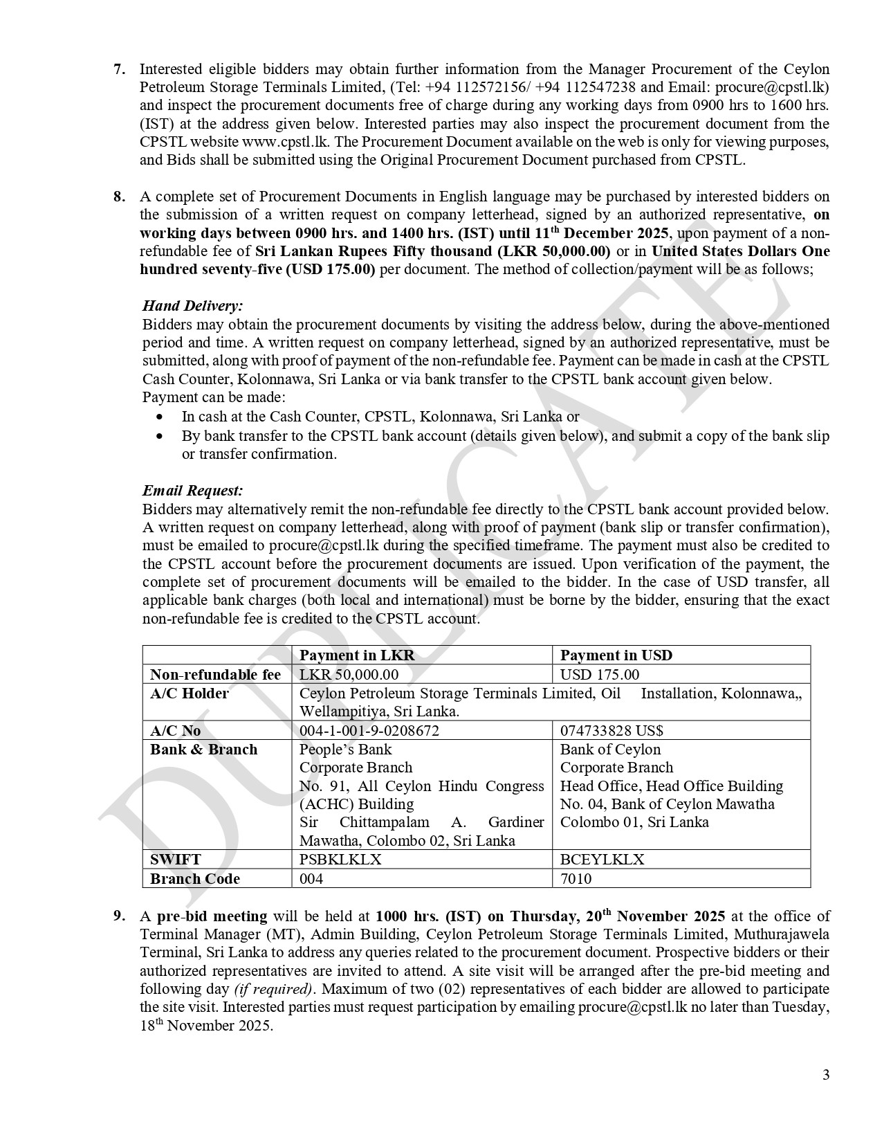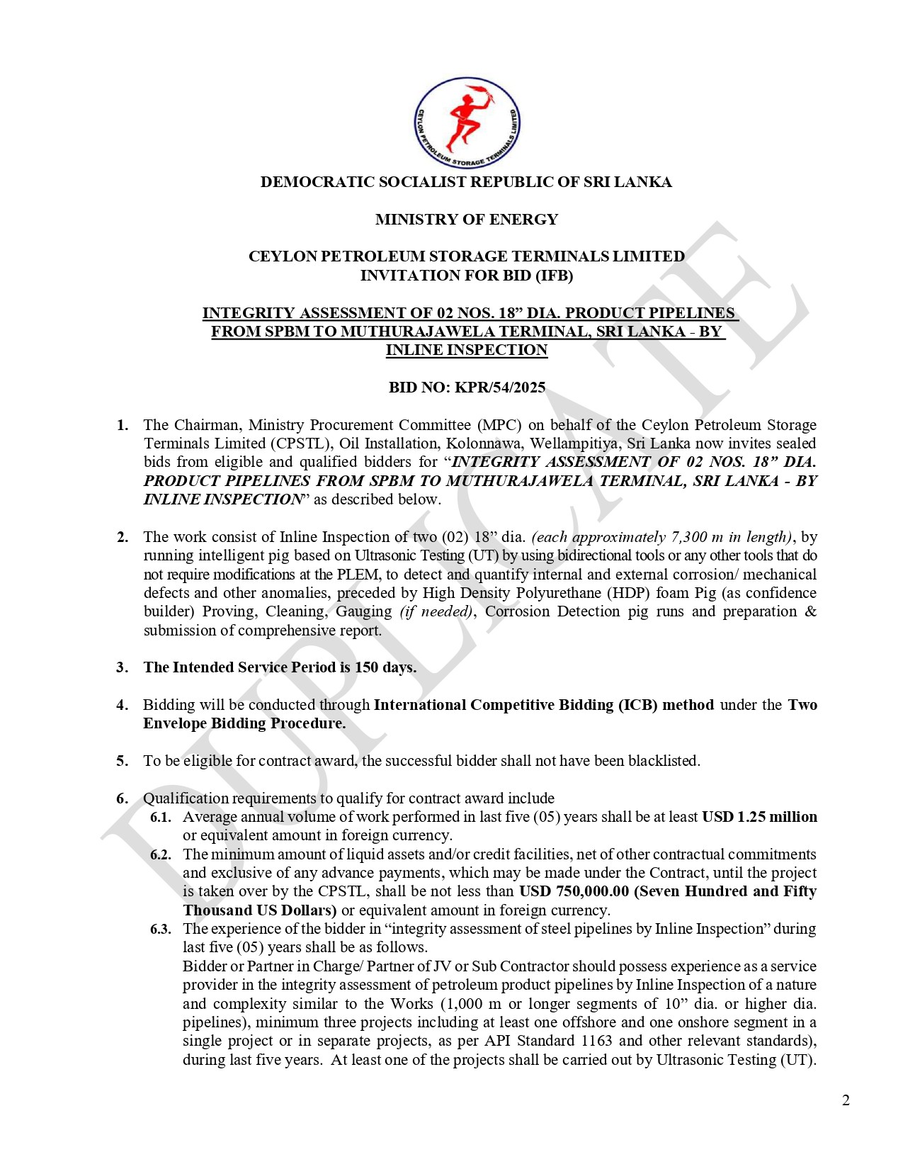Invitation for Bids (IFB) – Ceylon Petroleum Storage Terminals Limited Procurement of Integrity Assessment of 02 Nos. 18” DIA. Product Pipelines from SPBM to Muthurajawela Terminal, Sri Lanka