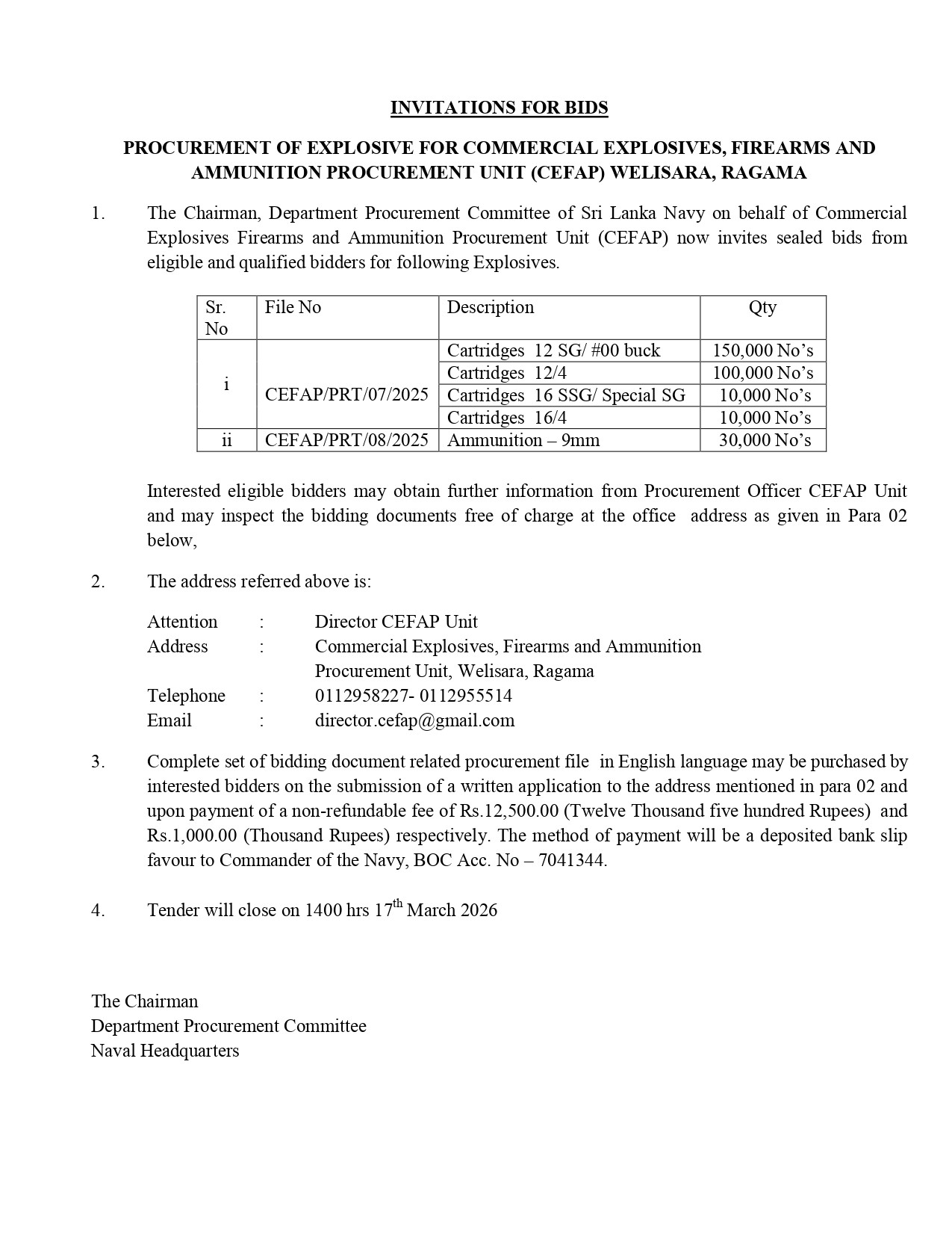 Invitation for Bids (IFB) – Commercial Explosives, Firearms and Ammunition Procurement Unit (CEFAP Unit) of Sri Lanka Navy Contract No: CEFAP/PRT/07/2025 & CEFAP/PRT/08/2025