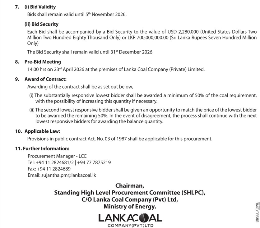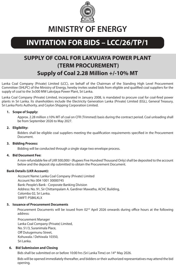 21.04.2026 - 11:00 Invitation for Bids (IFB) - Ministry of Energy MINISTRY OF ENERGY INVITATION FOR BIDS - LCC/26/TP/1 SUPPLY OF COAL FOR LAKVIJAYA POWER PLANT (TERM PROCUREMENT) Supply of Coal 2.28 Million +/-10% MT