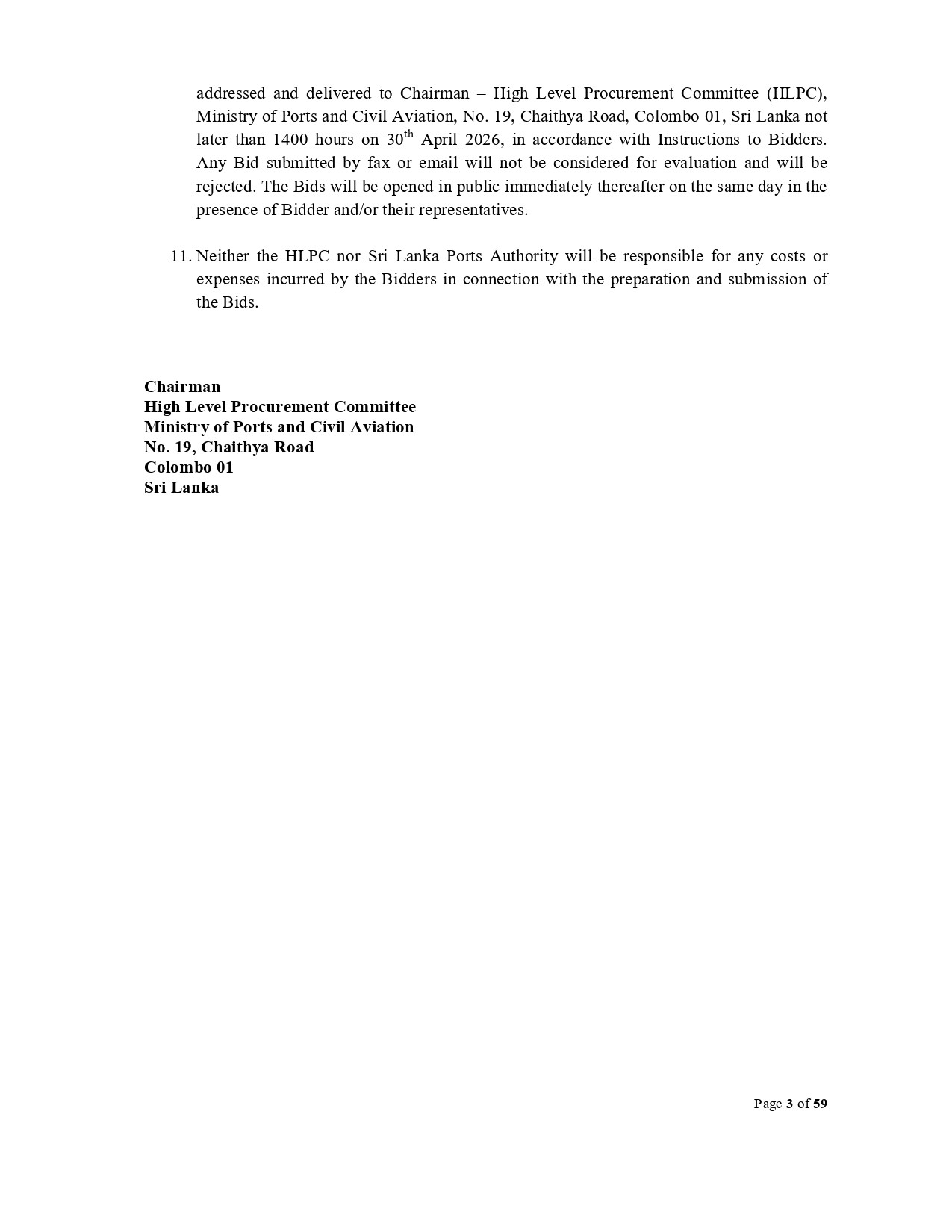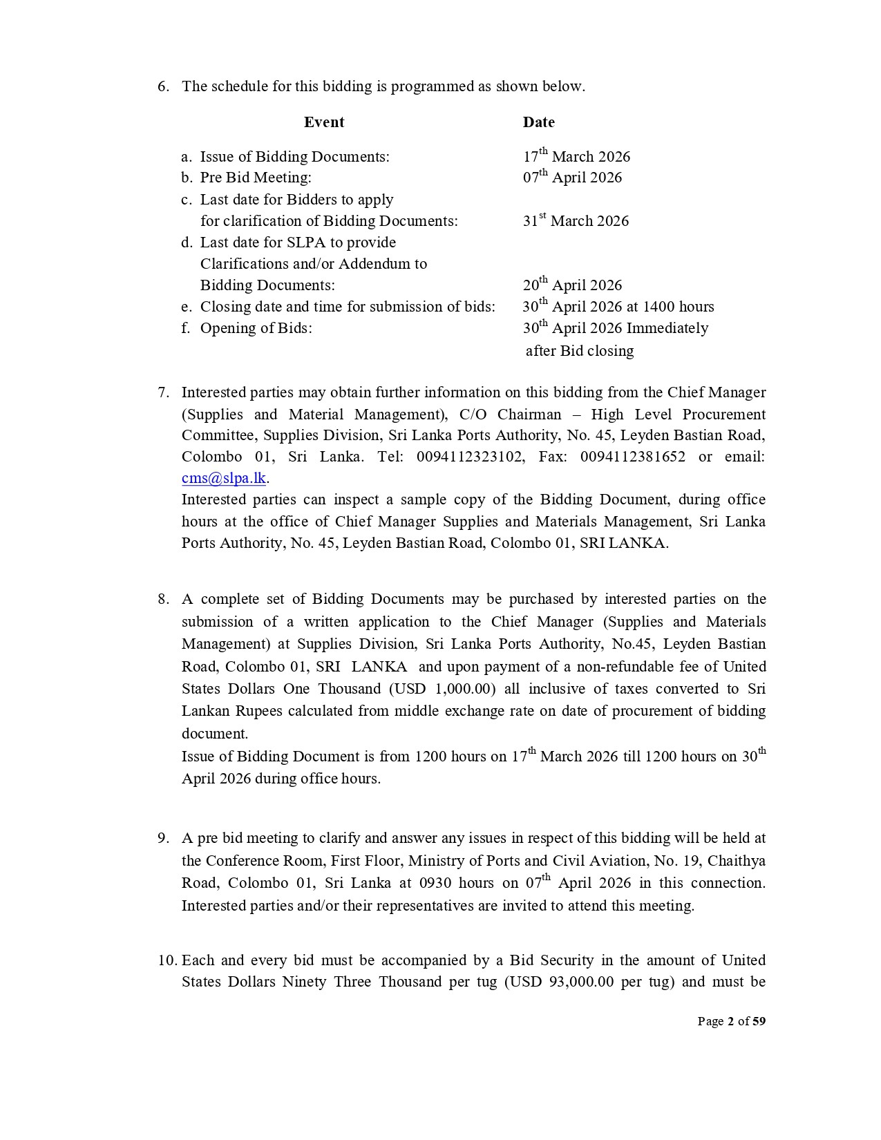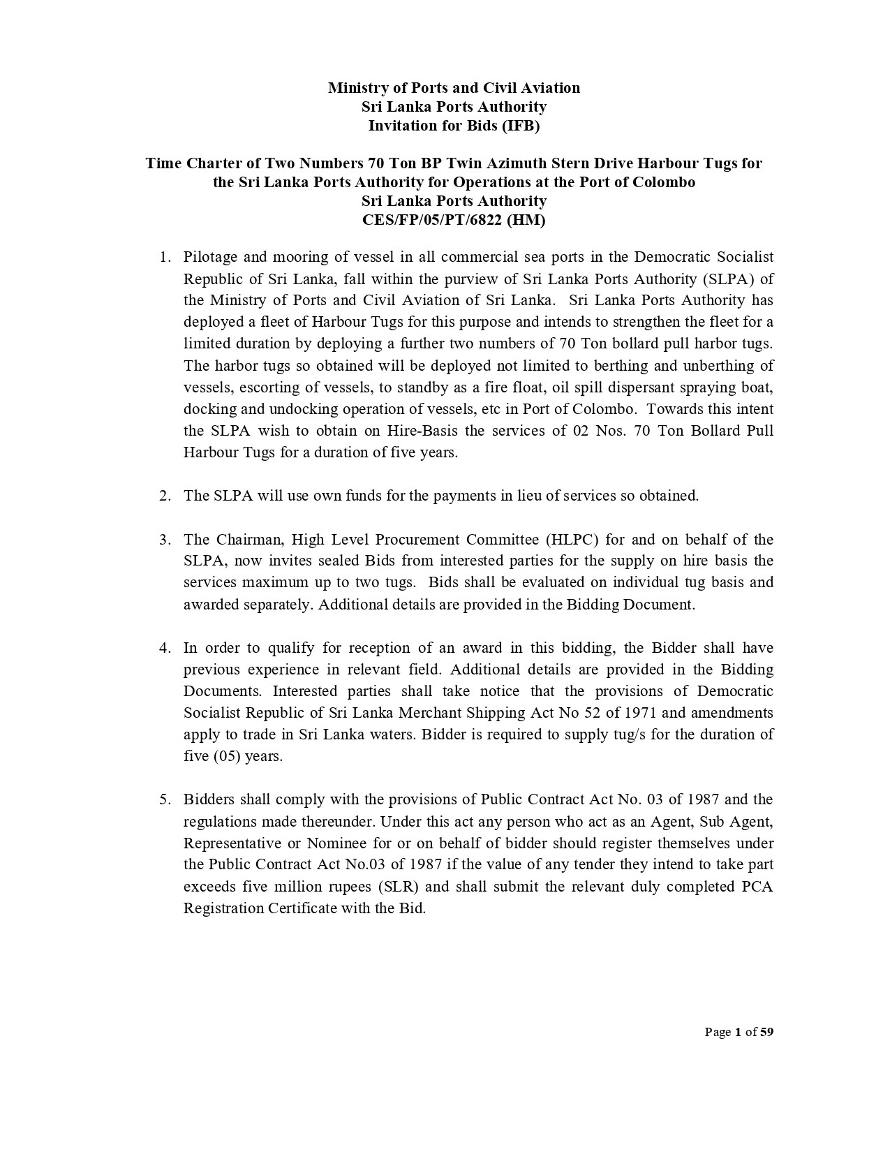 Invitation for Bids (IFB) - Ministry of Ports and Civil Aviation Time Charter of Two Numbers 70 Ton BP Twin Azimuth Stern Drive Harbour Tugs for the Sri Lanka Ports Authority for Operations at the Port of Colombo