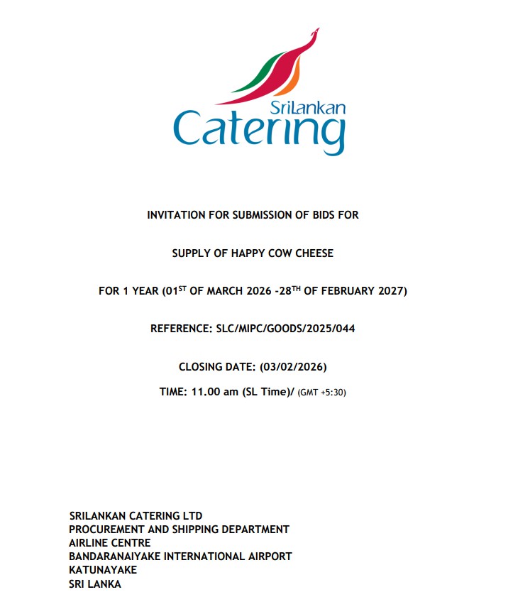 6.01.2026 - 11:28 Invitation for Bids (IFB) - SriLankan Catering Ltd INVITATION FOR SUBMISSION OF BIDS FOR SUPPLY OF HAPPY COW CHEESE FOR 1 YEAR (01ST OF MARCH 2026 -28TH OF FEBRUARY 2027) Read for more information