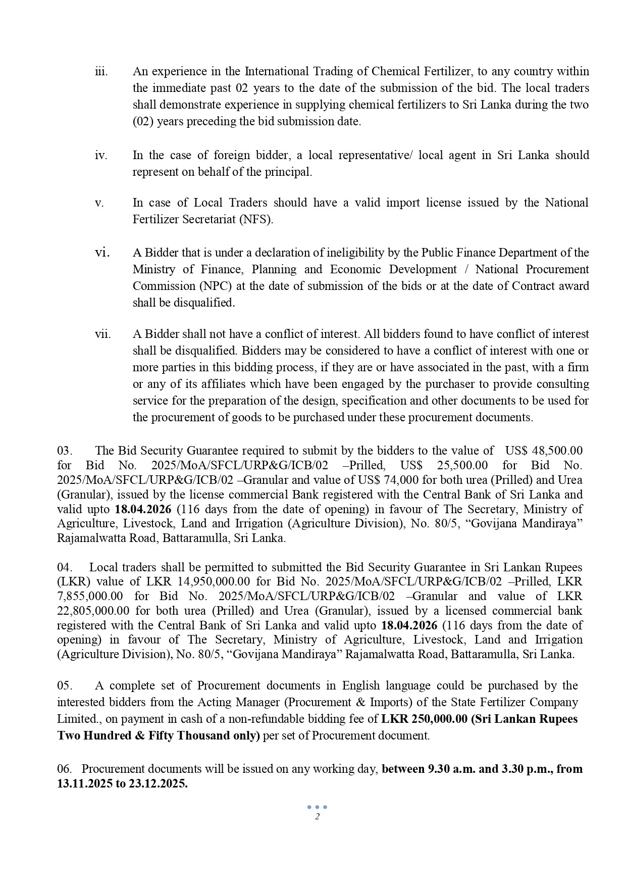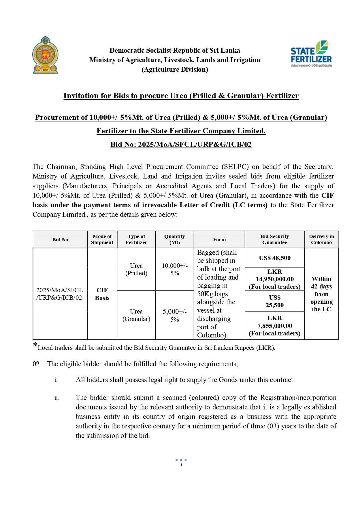 Invitation for Bids – Ministry of Agriculture, Livestock, Lands and Irrigation Procurement of 10,000+/-5%Mt. of Urea (Prilled) & 5,000+/-5%Mt of Urea (Granular) Fertilizer to the State Fertilizer Company Limited Bid No: 2025/MoA/SFCL/URP&G/ICB