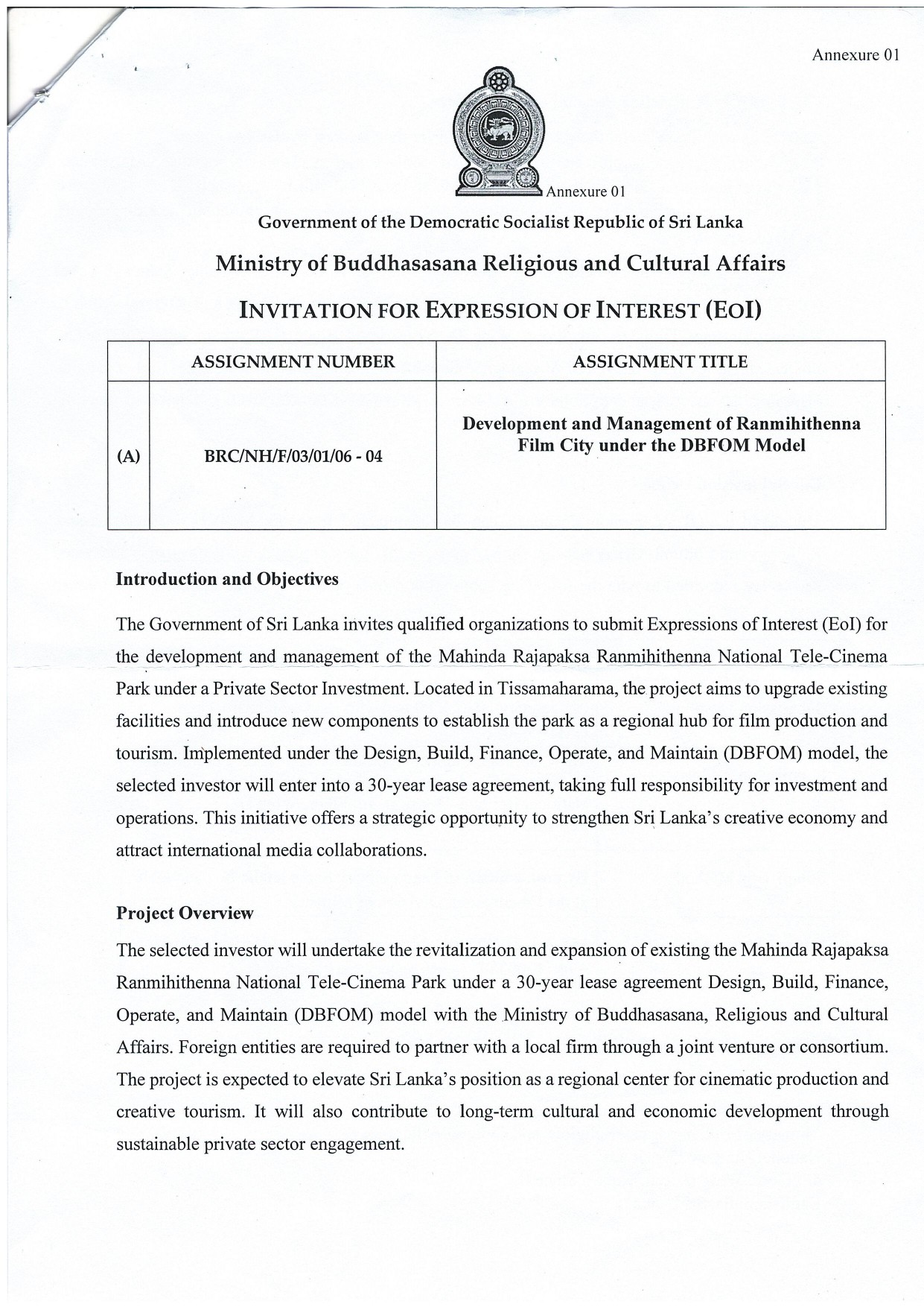 Invitation for Expression of Interest (EoI) – Ministry of Buddhasasana Religious and Cultural Affairs Development and Management of Ranmihithenna Film City under the DBFOM Model Assignment No: BRC/NH/F/03/01/06-04