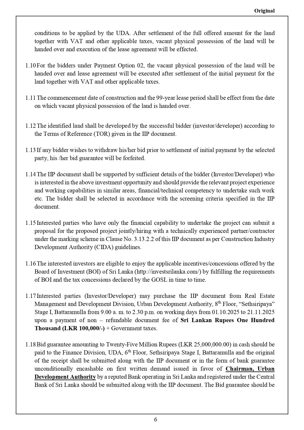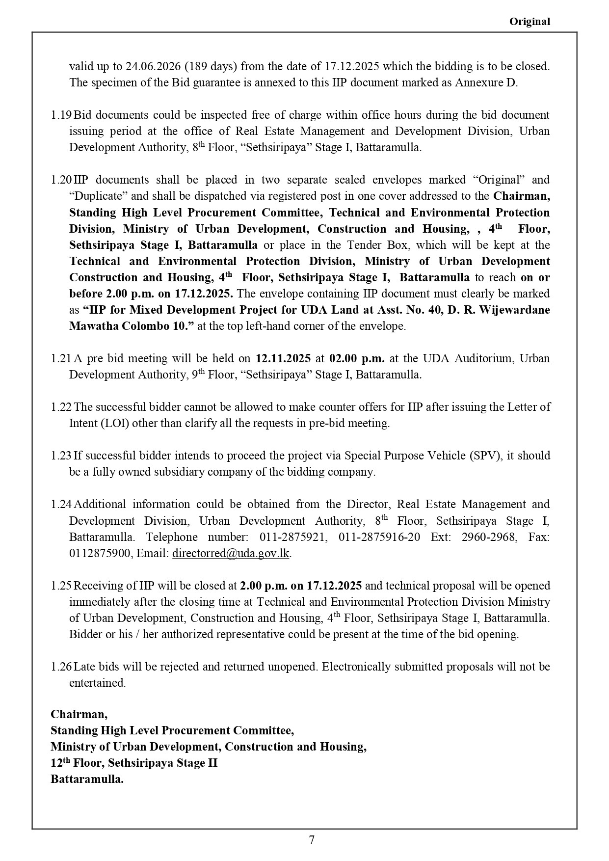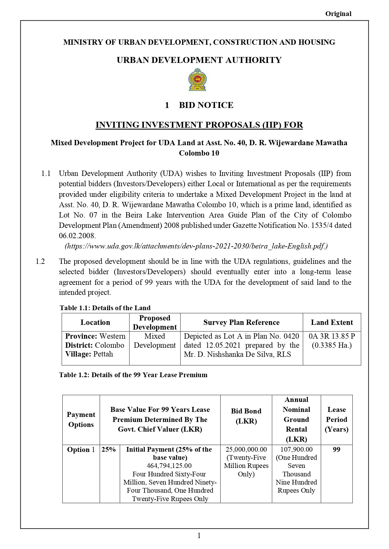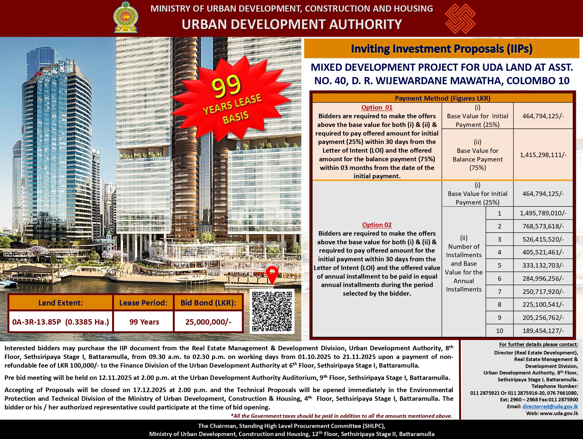 Inviting Investment Proposals (IIPs) – Urban Development Authority Mixed Development Project for UDA Land at Asst. No. 40, D.R. Wijewardane Mawatha Colombo 10
