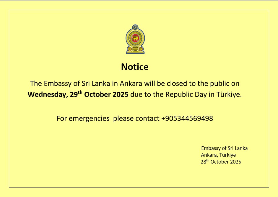 28.10.2025 - 11:28 The Embassy of Sri Lanka in Ankara will be closed to the public on Wednesday, 29th October 2025 due to the Republic Day in Türkiye. For emergencies please contact +905344569498 Embassy of Sri Lanka Ankara, Türkiye 28th October 2025