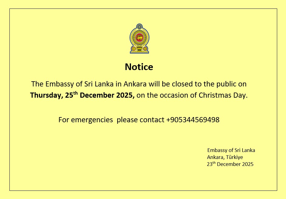 23.12.2025 - 16:41 Notice The Embassy of Sri Lanka in Ankara will be closed to the public on Thursday, 25th December 2025, on the occasion of Christmas Day. For emergencies please contact +905344569498 Embassy of Sri Lanka Ankara, Türkiye 23th December 2025