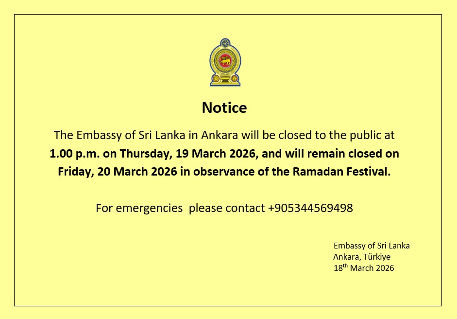 18.03.2026 - 14:50 Notice The Embassy of Sri Lanka in Ankara will be closed to the public at 1.00 p.m. on Thursday, 19 March 2026, and will remain closed on Friday, 20 March 2026 in observance of the Ramadan Festival. For emergencies please contact +905344569498
