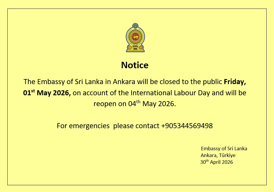 30.04.2026 - 15:33 Notice The Embassy of Sri Lanka in Ankara will be closed to the public Friday, 01st May 2026, on account of the International Labour Day and will be reopen on 04th May 2026. For emergencies please contact +905344569498