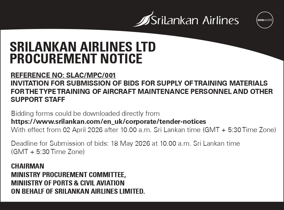 Procurement Notice – SriLankan Airlines Ltd Invitation for Submission of Bids for the Supply of Training Materials for the Type Training of Aircraft Maintenance Personnel and Other Support Staff Reference No.: SLAC/MPC/001