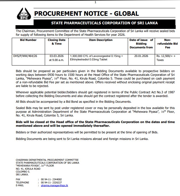 22.01.2026 - 12:57 Procurement Notice - State Pharmaceuticals Corporation of Sri Lanka Read for more information