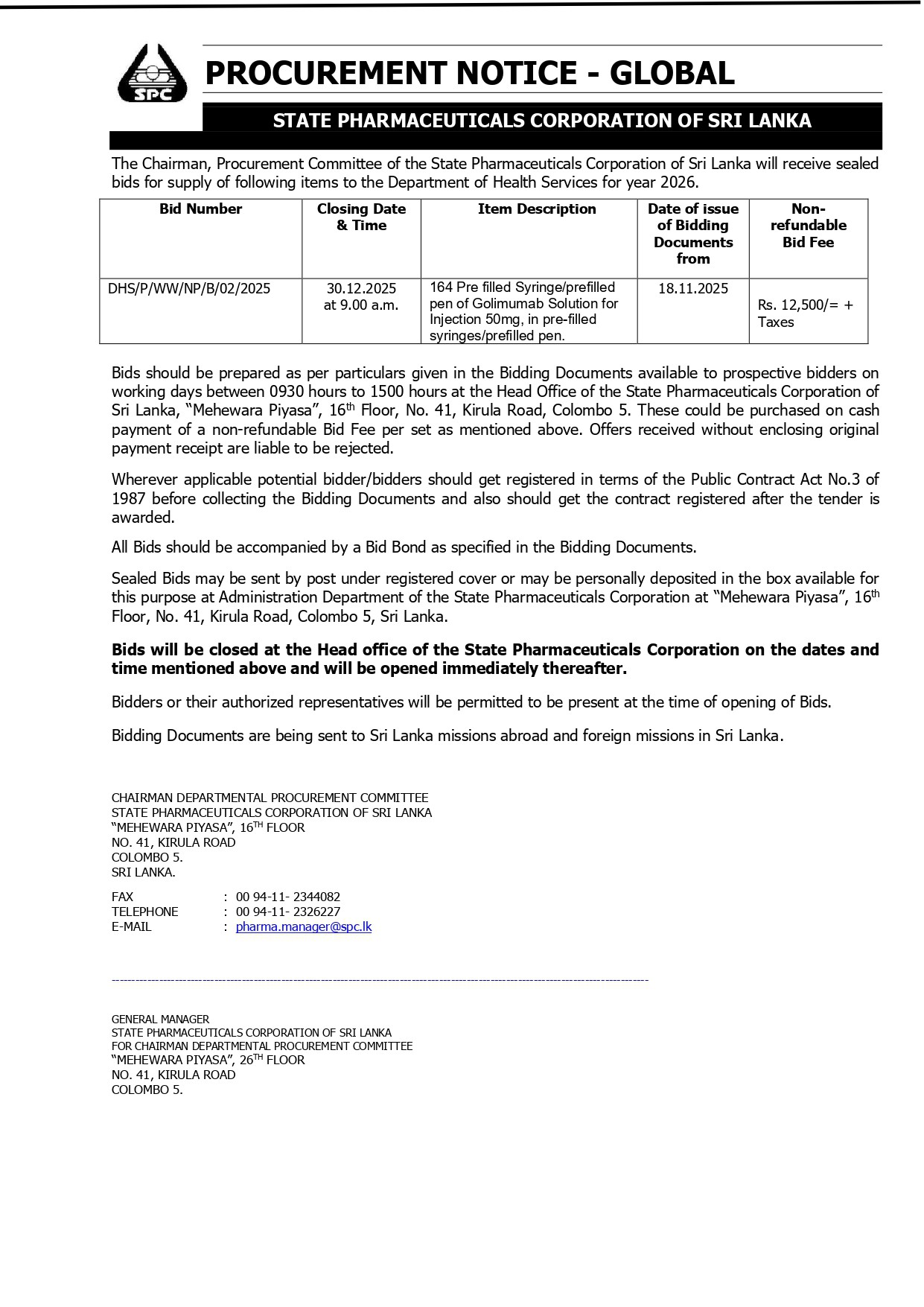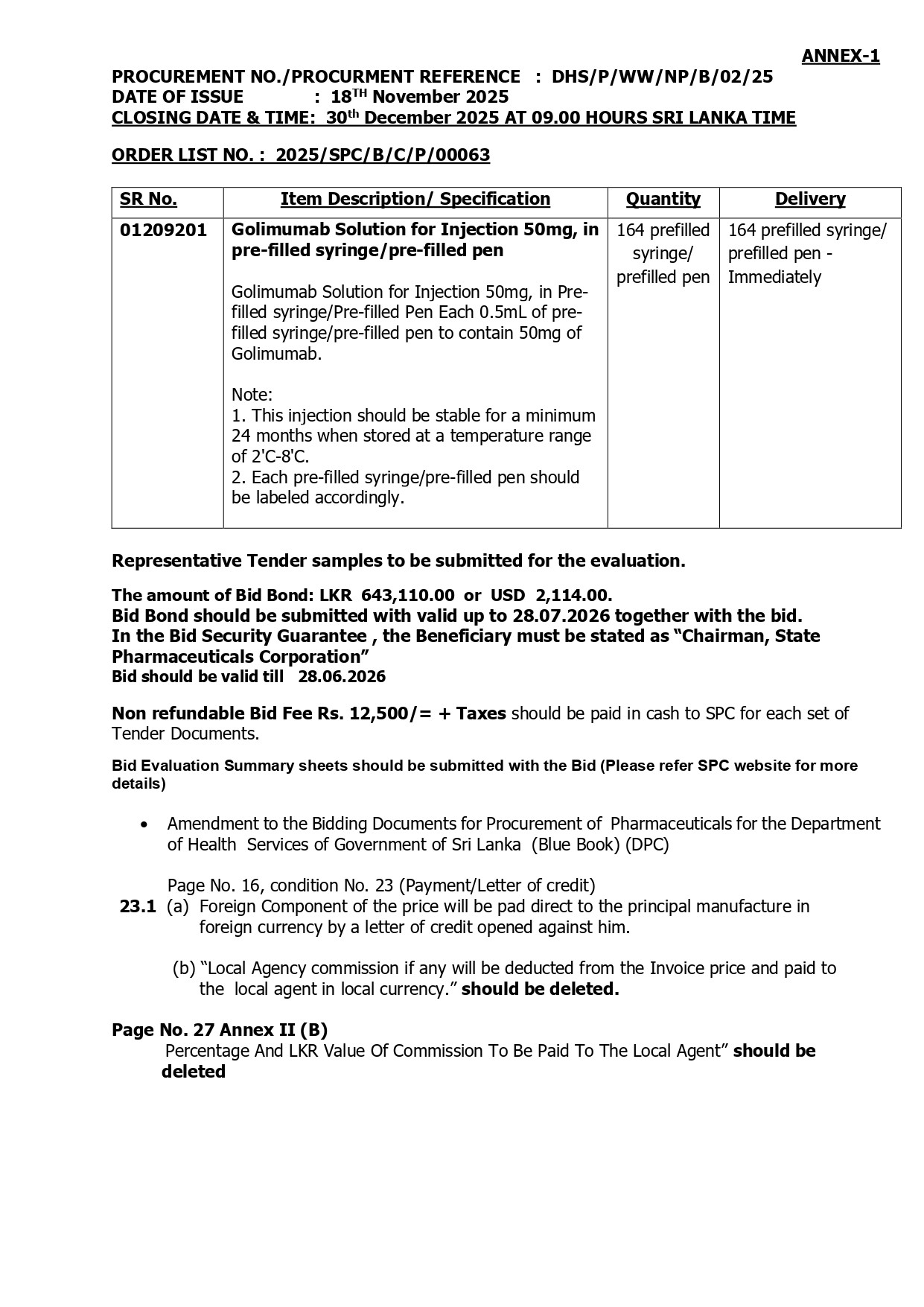 Procurement Notices - State Pharmaceuticals Corporation of Sri Lanka -164 Pre-filled Syringe/prefilled Pen of Golimumab Solution for Injection 50mg, in pre-filled syringes/prefilled pen.