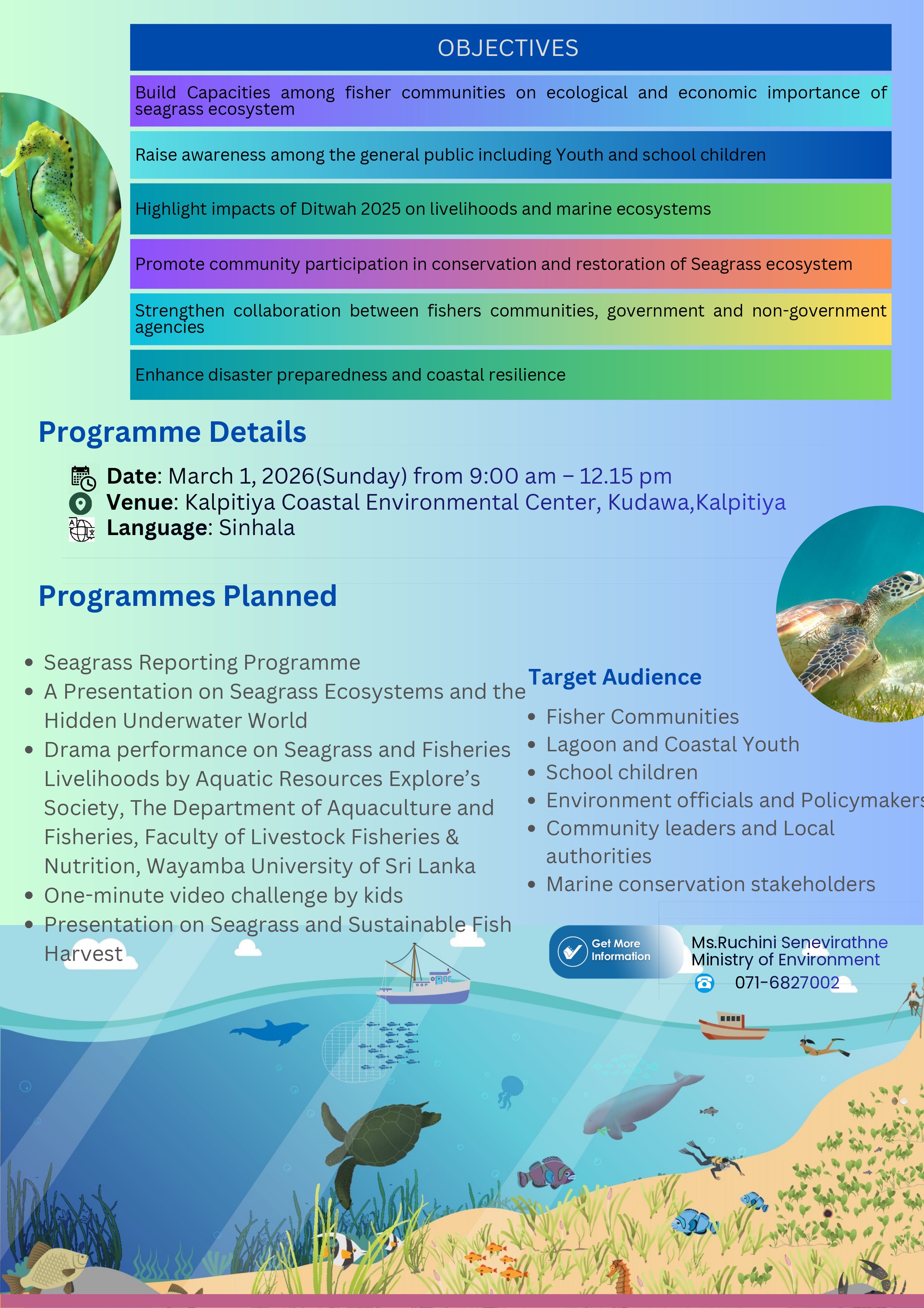 Sri Lanka will commemorate World Seagrass Day on 1 March 2026 at the Kalpitiya Coastal Environmental Center under the theme: