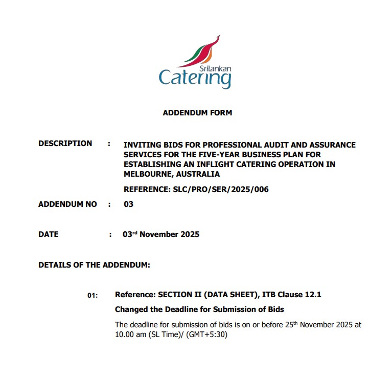 Addendum Notice – SriLankan Catering Ltd Inviting Bids for Professional Audit and Assurance Services for the Five-Year Business Plan for Establishing an Inflight Catering Operation in Melbourne, Australia Reference No.: SLC/PRO/SER/2025/006