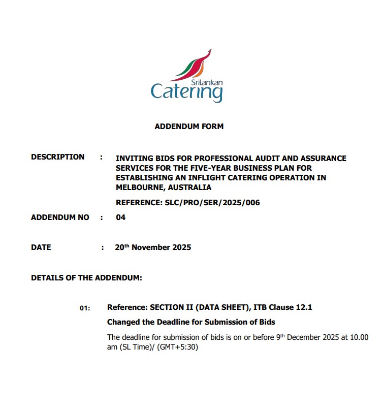 Addendum Notice - SriLankan Catering Ltd Inviting Bids for Professional Audit & Assurance Services for the Five-Year Business Plan for Establishing an Inflight Catering Operation in Melbourne, Australia