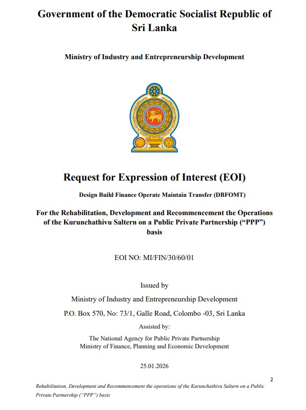 Call for EOI for the Design Build Finance Operate Maintain Transfer for the Rehabilitation, Development and Recommencement of the Operations of the Kurunchthivu Saltern on a Public Private Partnership