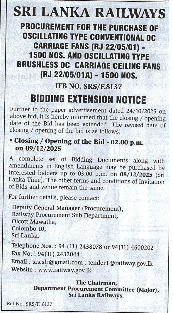 Extension Notice – Sri Lanka Railways Procurement for the Purchase of Oscillating Type Conventional DC Carriage Ceiling Fans (RJ 22/05/01)