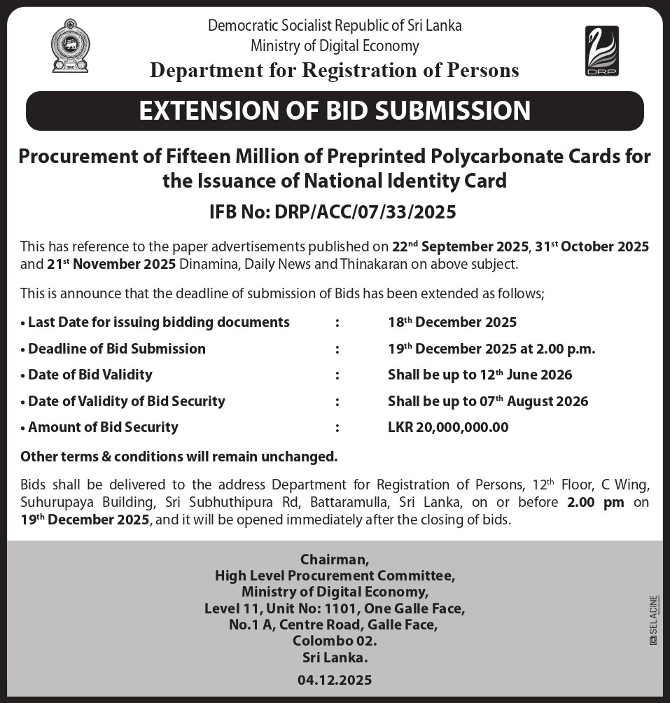 Extension of Bid Submission – Department for Registration of Persons Procurement of Fifteen Million Pre-Printed Polycarbonate Cards for the Issuance of National Identity Cards