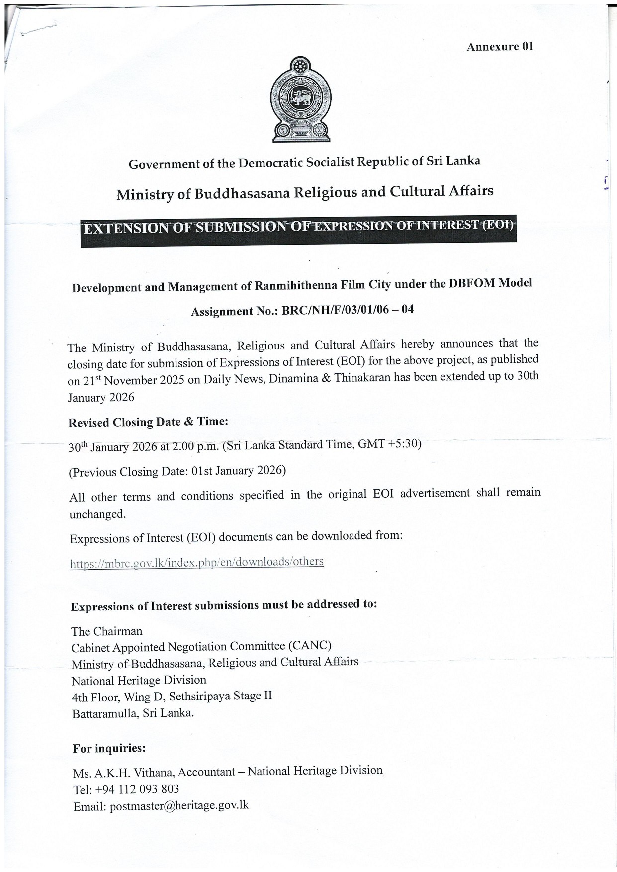Extension of Submission of Expression of Interest (EOI) - Ministry of Buddhasasana Religious and Cultural Affairs Development and Management of Ranmihithenna
