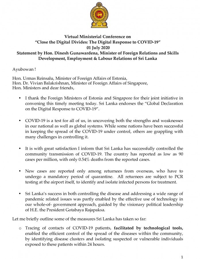Visionary political leadership of President Gotabaya Rajapaksa and the effective use of technology in a whole – of – government approach has enabled Sri Lanka to control the COVID-19 and a wide range of pandemic related issues – said Foreign Minister Dinesh Gunawardena addressing the Virtual Ministerial Conference on ‘Close the Digital Divides: the Digital Response to COVID-19’.