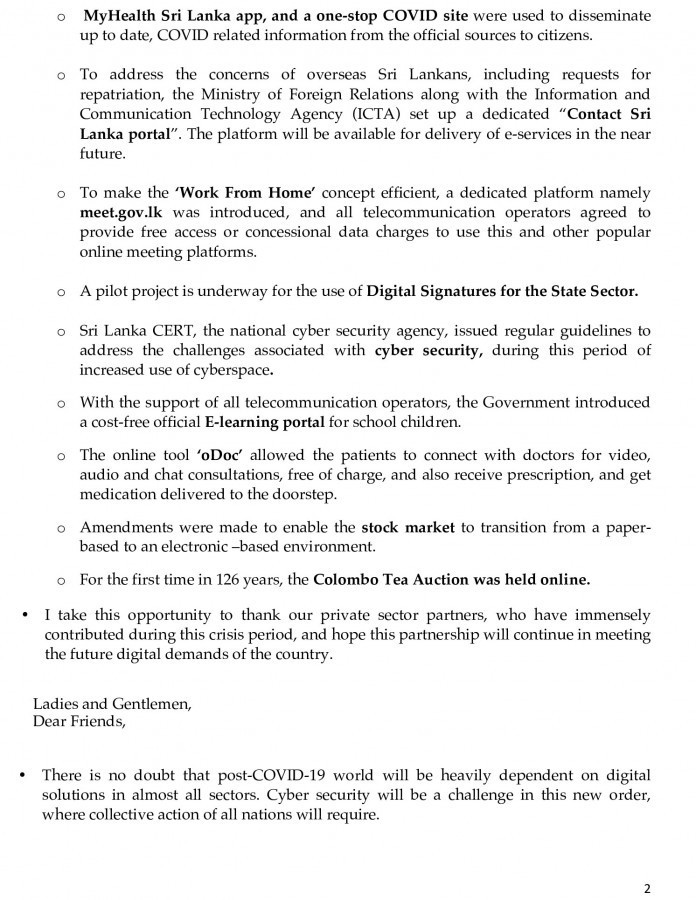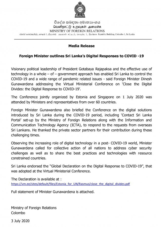 Sri Lanka endorsed the “Global Declaration on the Digital Response to COVID-19”, that was adopted at the Virtual Ministerial Conference.