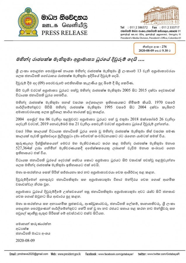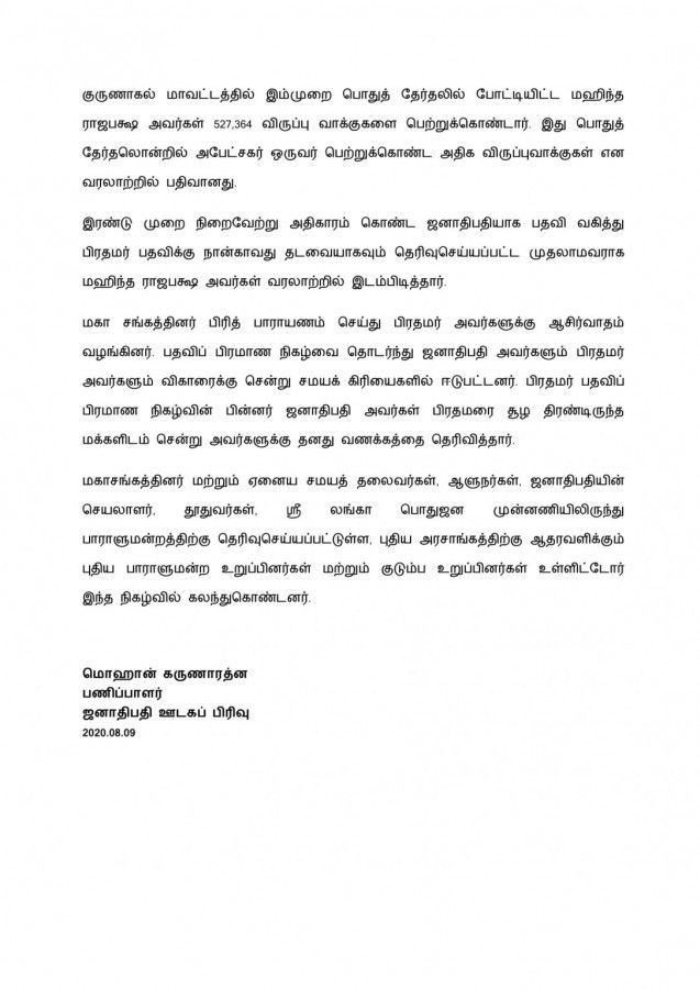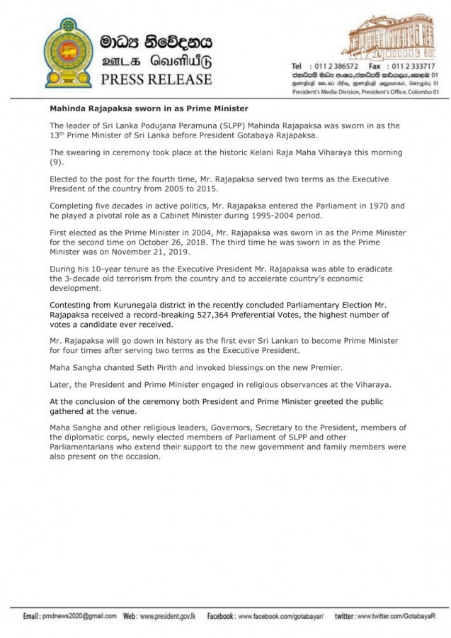 The leader of Sri Lanka Podujana Peramuna (SLPP) Mahinda Rajapaksa was sworn in as the 13th Prime Minister of Sri Lanka before President Gotabaya Rajapaksa. The swearing in ceremony took place at the historic Kelani Raja Maha Viharaya this morning (9). Elected to the post for the fourth time, Mr. Rajapaksa served two terms as the Executive President of the country from 2005 to 2015. Completing five decades in active politics, Mr. Rajapaksa entered the Parliament in 1970 and he played a pivotal role as a Cabinet Minister during 1995-2004 period. First elected as the Prime Minister in 2004, Mr. Rajapaksa was sworn in as the Prime Minister for the second time on October 26, 2018.The third time he was sworn in as the Prime Minister was on November 21, 2019. During his 10-year tenure as the Executive President Mr. Rajapaksa was able to eradicate the 30-decade old terrorism from the country and to accelerate country’s economic development. Contesting from Kurunegala district in the recently concluded Parliamentary Election Mr. Rajapaksa received a record-breaking 527,364 Preferential Votes, the highest number of votes a candidate ever received. Mr. Rajapaksa will go down in history as the first ever Sri Lankan to become Prime Minister for four times after serving two terms as the Executive President. Maha Sangha chanted Seth Pirith and invoked blessings on the new Premier. Later, the President and Prime Minister engaged in religious observances at the Viharaya. At the conclusion of the ceremony both President and Prime Minister greeted the public gathered at the venue. Maha Sangha and other religious leaders, Governors, Secretary to the President,