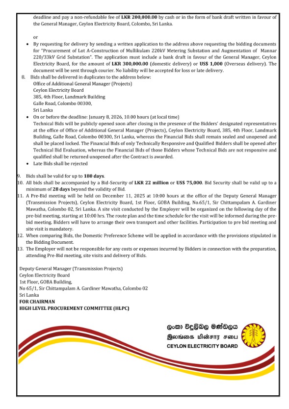 Invitation for Bids (IFB) - Ceylon Electricity Board Mullikulam Wind Power Transmission Project (MWPTP) Lot A: Construction of the Incomer Side of Mullikulam 220/33kV Collector Grid Substation and Construction of 02 nos of 220kV