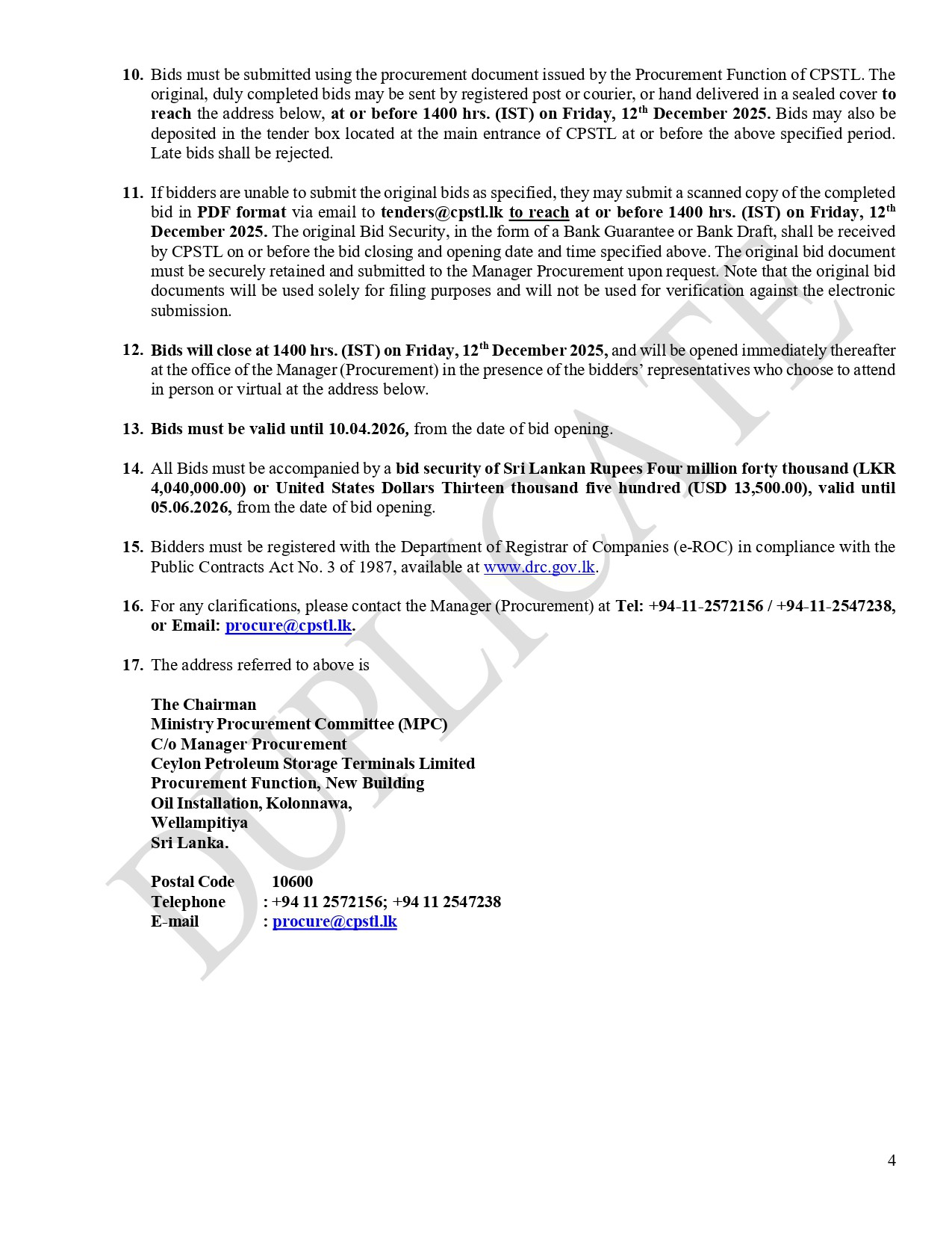 Invitation for Bids (IFB) – Ceylon Petroleum Storage Terminals Limited Procurement of Integrity Assessment of 02 Nos. 18” DIA. Product Pipelines from SPBM to Muthurajawela Terminal, Sri Lanka