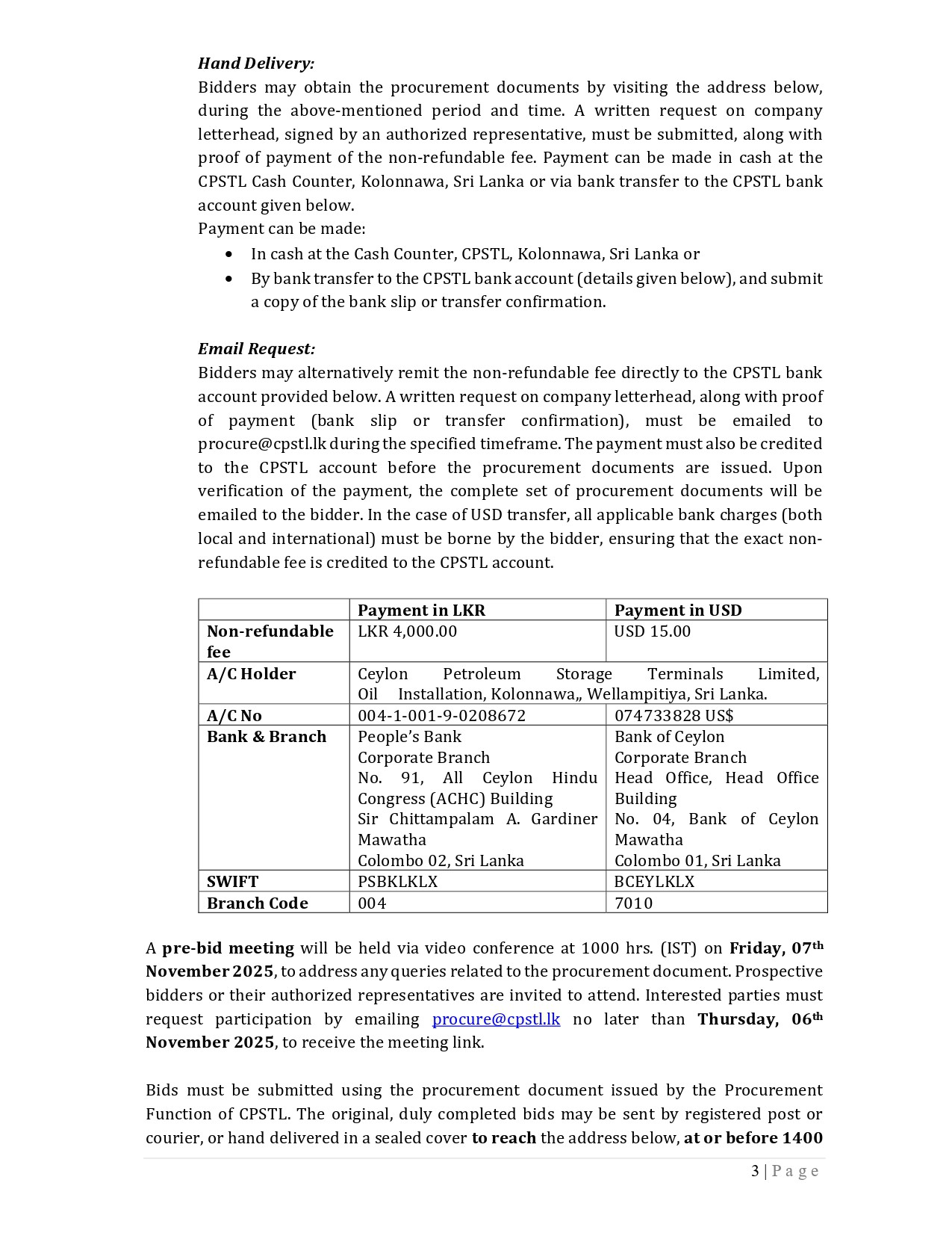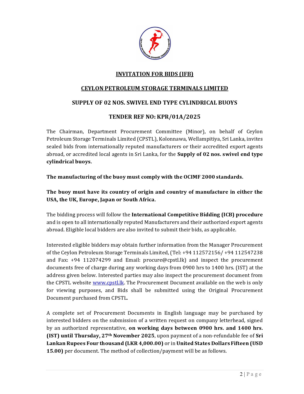Invitation for Bids (IFB) – Ceylon Petroleum Storage Terminals Limited Supply of 02 Nos. Swivel End Type Cylindrical Buoys Tender