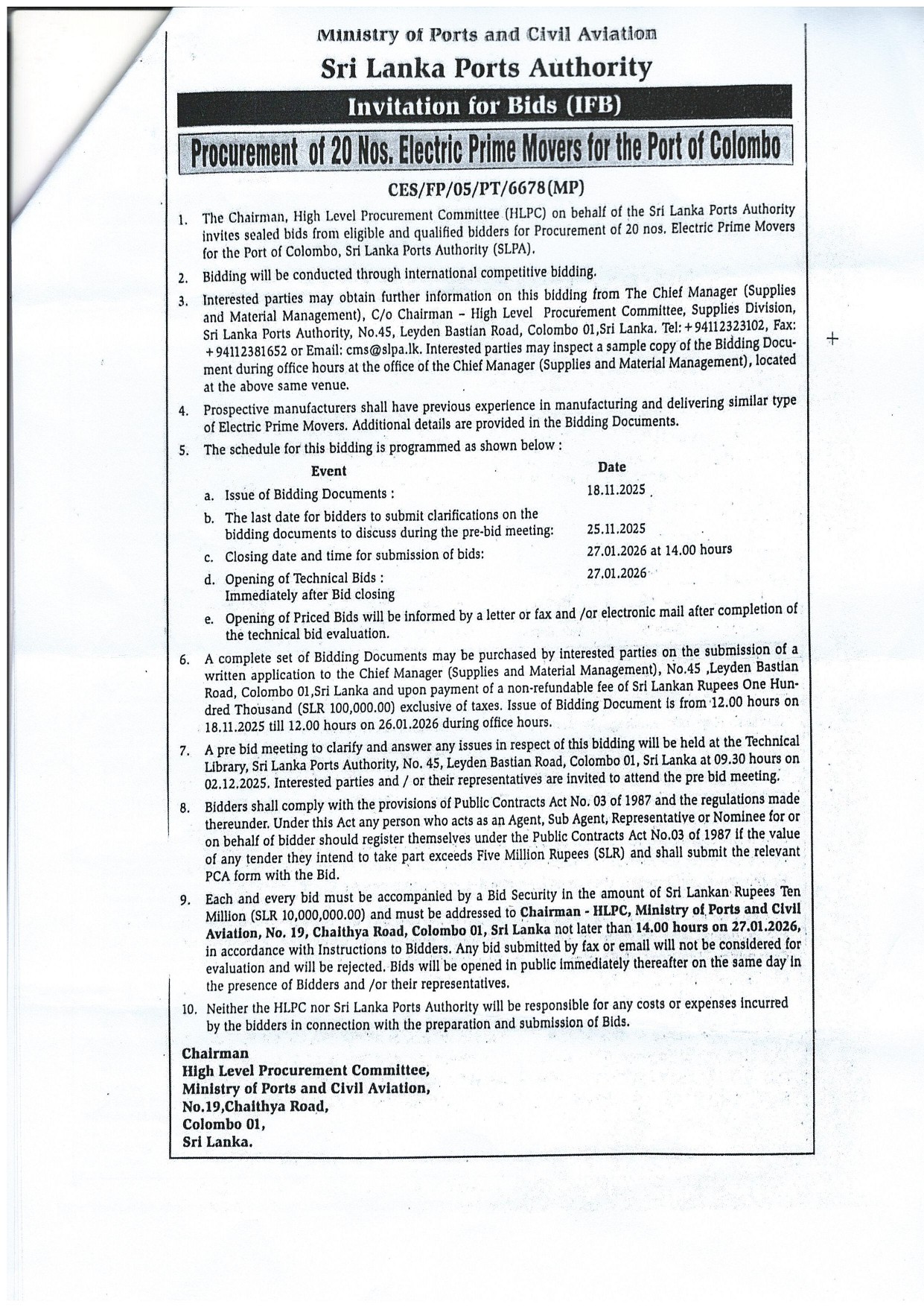 Invitation for Bids (IFB) – Ministry of Ports and Civil Aviation Procurement of 20 Nos. Electric Prime Movers for the Port of Colombo No. CES/FP/05/PT/6678 (MP)