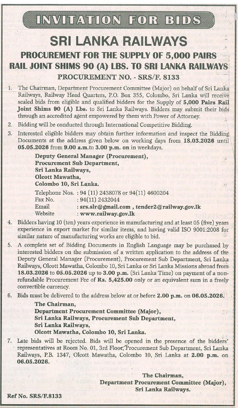 Invitation for Bids (IFB) – Sri Lanka Railways Procurement for the Supply of 5000 Pairs Rail Joint Shims 90 (A) LBS. to Sri Lanka Railways Procurement No: SRS/F.8133