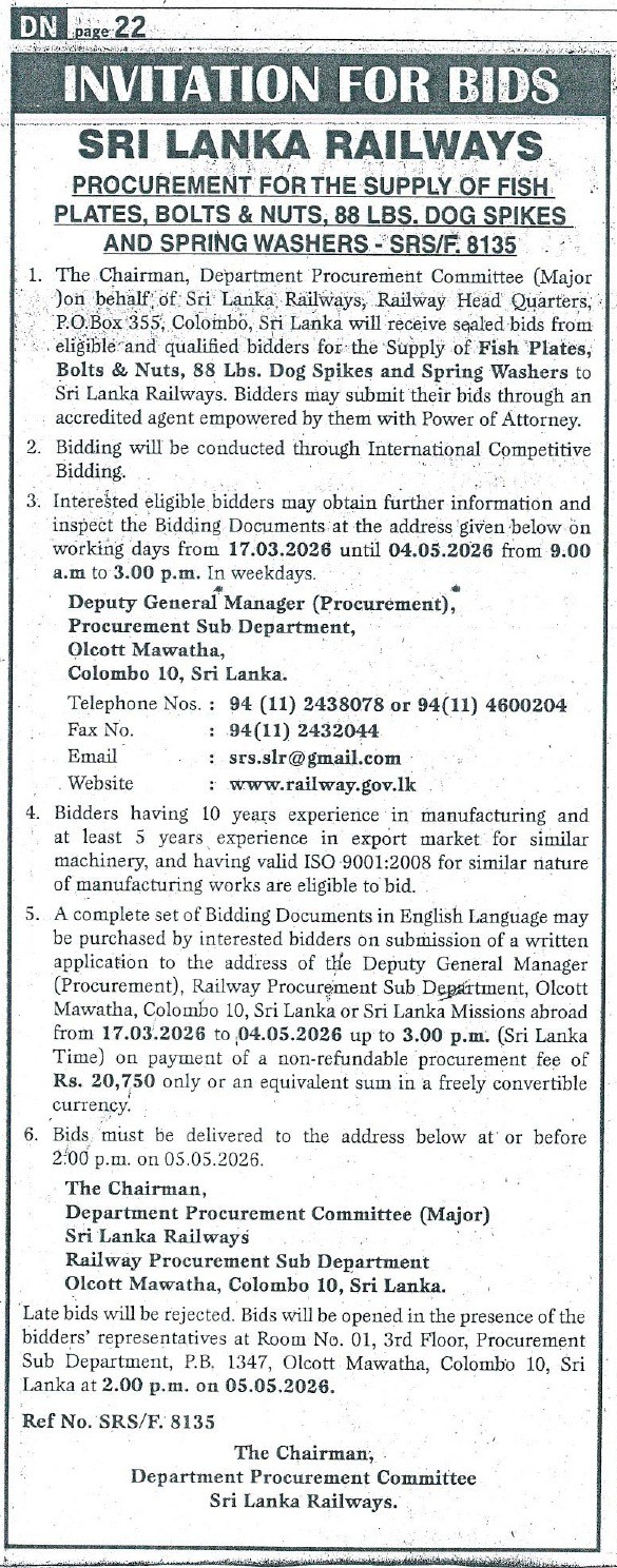 Invitation for Bids (IFB) - Sri Lanka Railways Procurement for the Supply of Fish Plates, Bolts and Nuts 88 Lbs. Dog Spikes and Spring Washes to Sri Lanka Railways