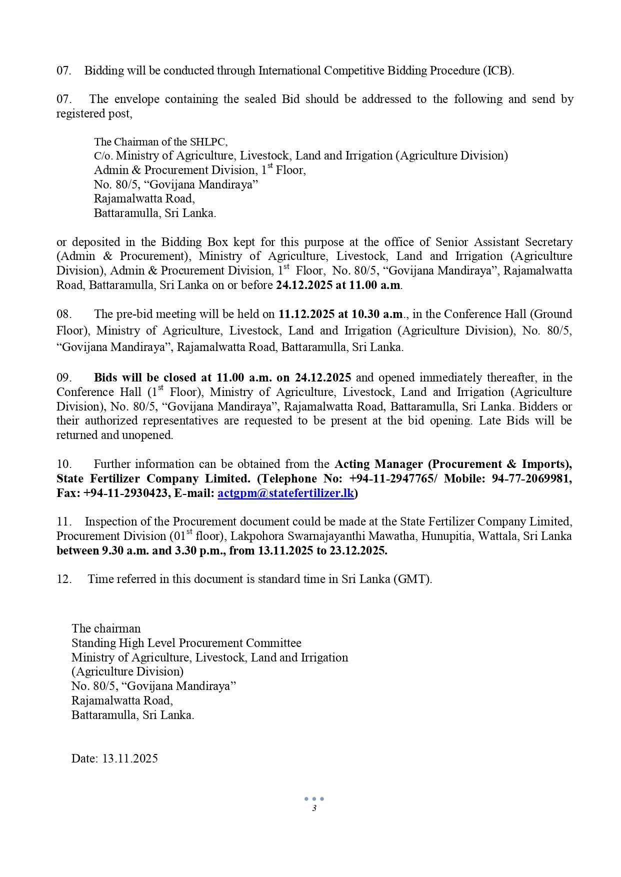 Invitation for Bids – Ministry of Agriculture, Livestock, Lands and Irrigation Procurement of 10,000+/-5%Mt. of Urea (Prilled) & 5,000+/-5%Mt of Urea (Granular) Fertilizer to the State Fertilizer Company Limited Bid No: 2025/MoA/SFCL/URP&G/ICB