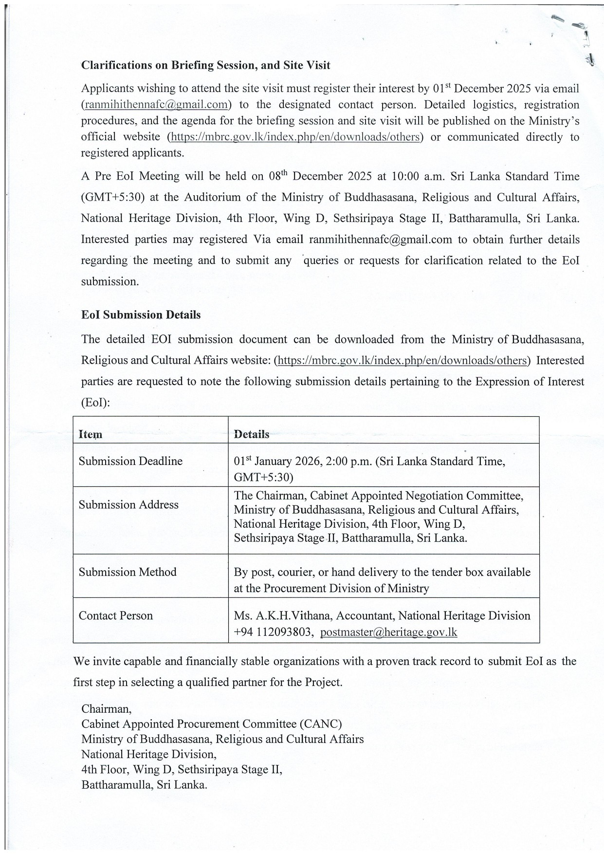Invitation for Expression of Interest (EoI) – Ministry of Buddhasasana Religious and Cultural Affairs Development and Management of Ranmihithenna Film City under the DBFOM Model Assignment No: BRC/NH/F/03/01/06-04