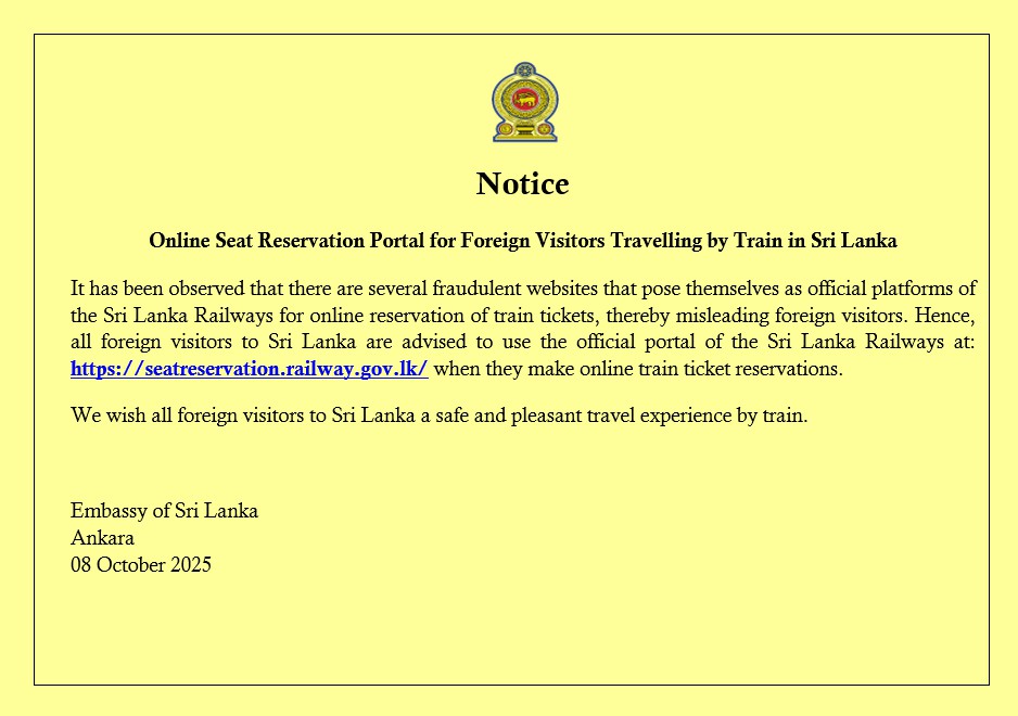 It has been observed that there are several fraudulent websites that pose themselves as official platforms of the Sri Lanka Railways for online reservation of train tickets, thereby misleading foreign visitors. Hence, all foreign visitors to Sri Lanka are advised to use the official portal of the Sri Lanka Railways at: https://seatreservation.railway.gov.lk/ when they make online train ticket reservations.
