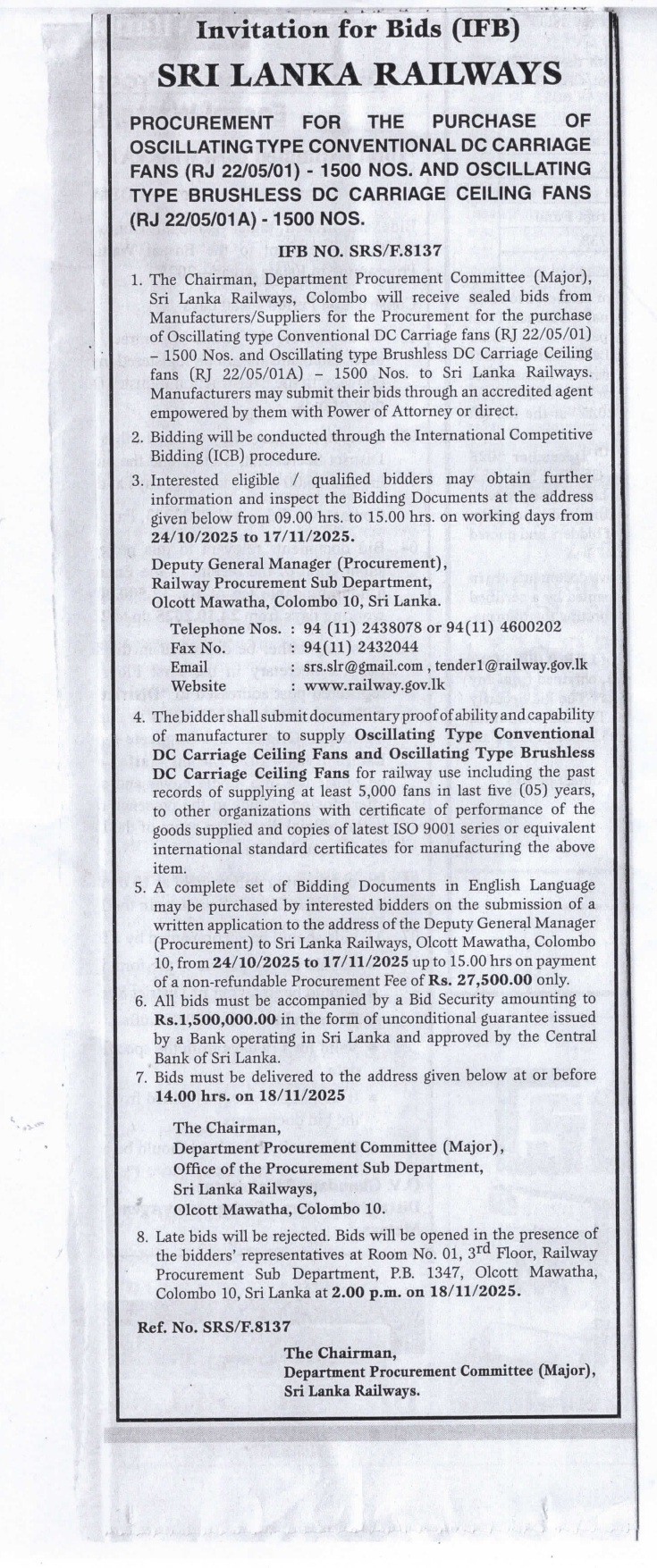 Procurement for the Purchase of Oscillating Type Conventional DC Carriage Ceiling Fans (RJ 22/05/01) – 1500 Nos. and Oscillating Type Brushless DC Carriage Ceiling Fans (RJ 22/05/01A) – 1500 Nos. IFB No.: SRS/F.8137
