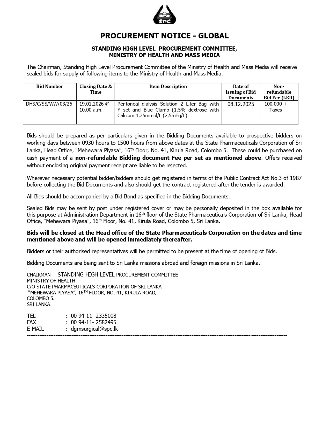 16.12.2025 - 16:46 Procurement Notice - State Pharmaceuticals Corporation of Sri Lanka (Bid Number – DHSCSSWW0325)