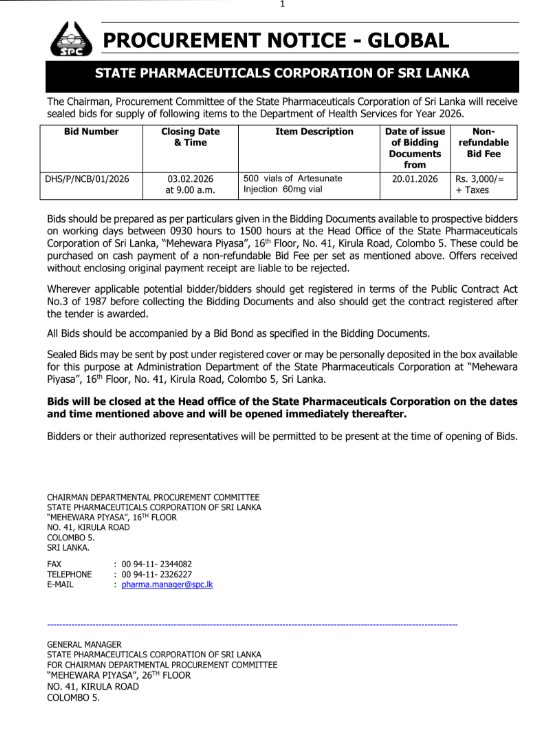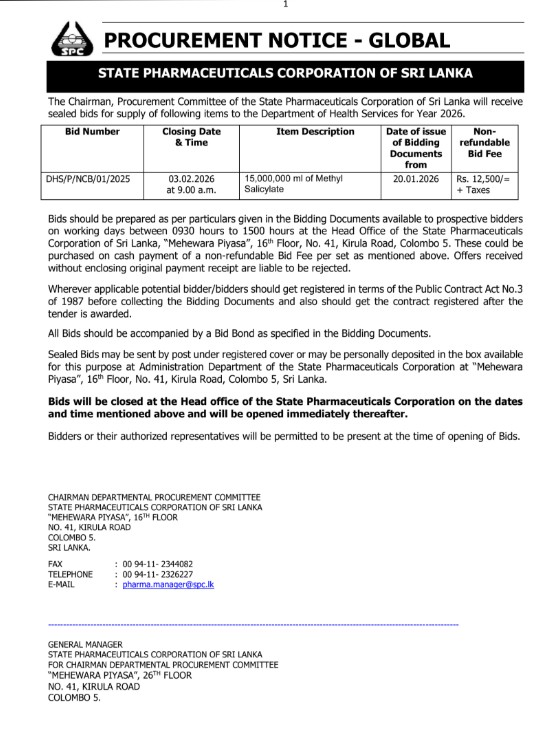 26.01.2026 - 17:38 Procurement Notices - State Pharmaceuticals Corporation of Sri Lanka Read for more information DHS P NCB 01 2025 DHS P NCB 03 2025 DHS P NCB 01 2026