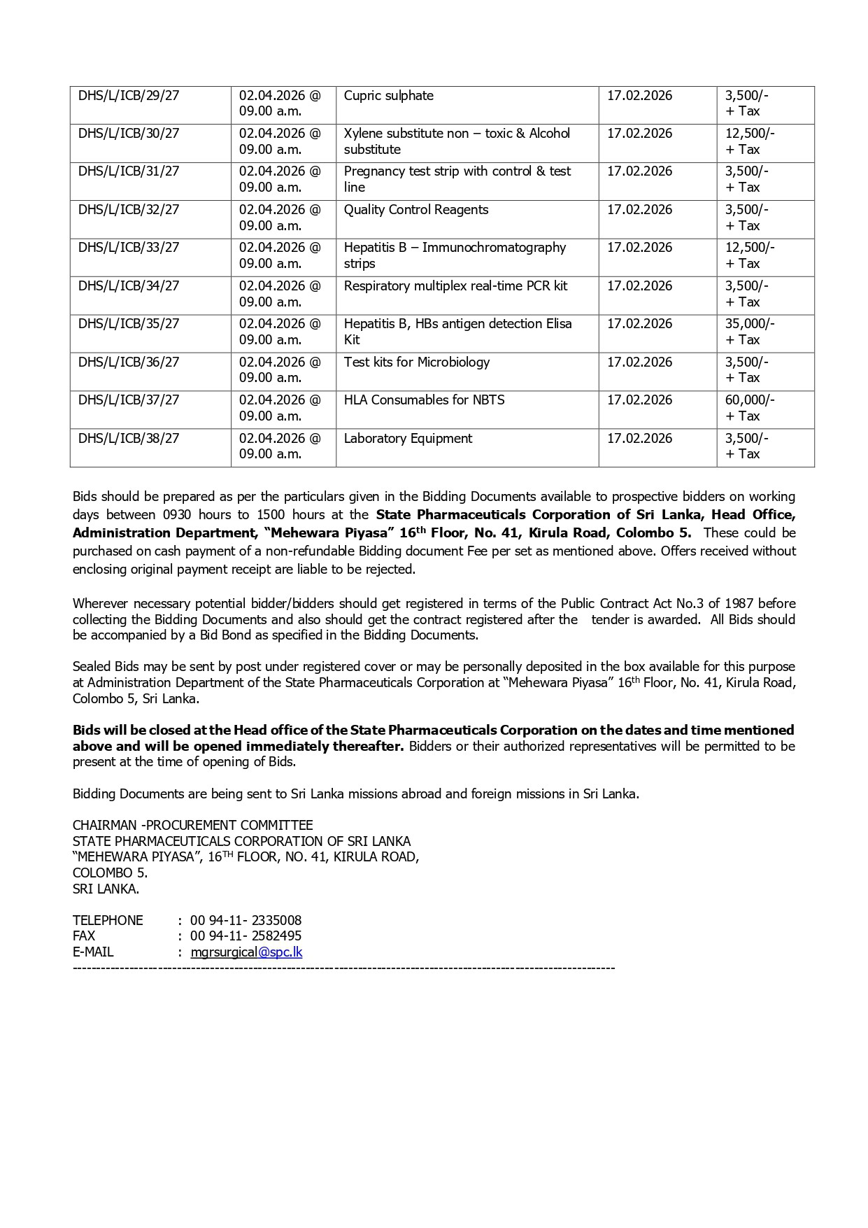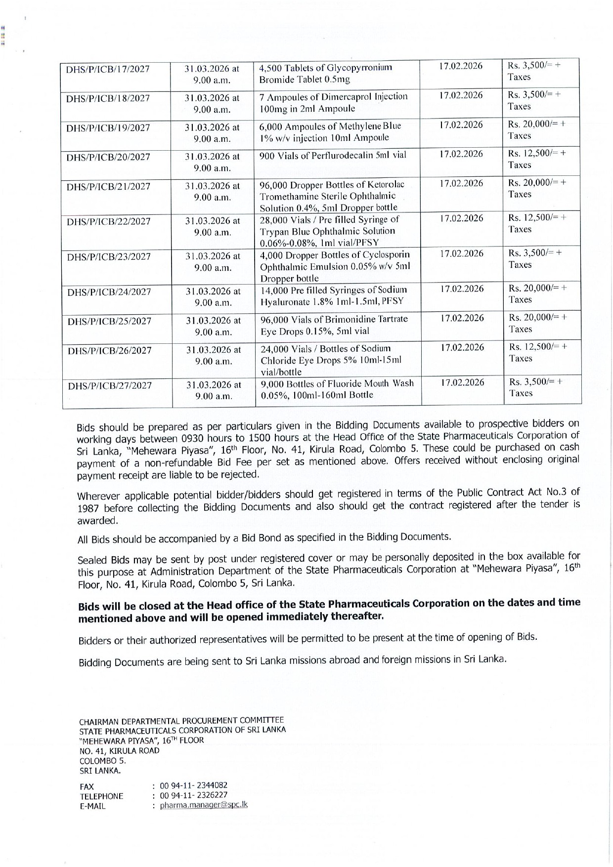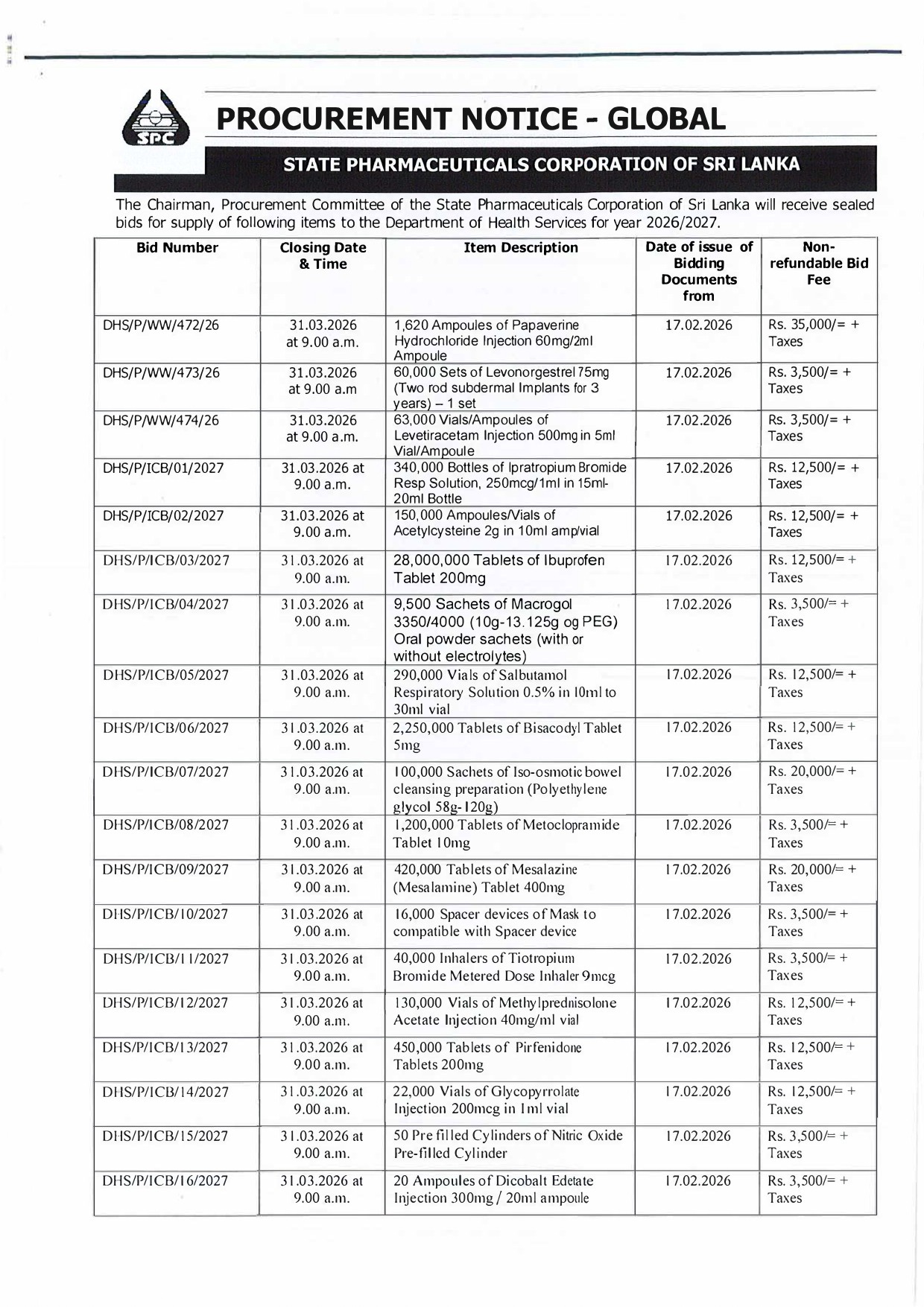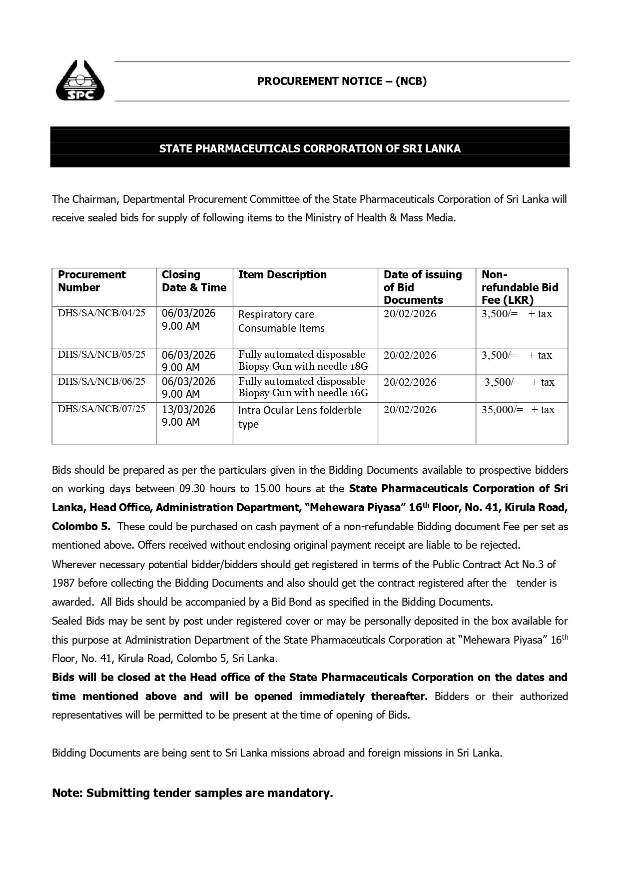 23.02.2026 - 18:20 Procurement Notices - State Pharmaceuticals Corporation of Sri Lanka Read for more information https://drive.google.com/.../1tvcOFaxjejns...