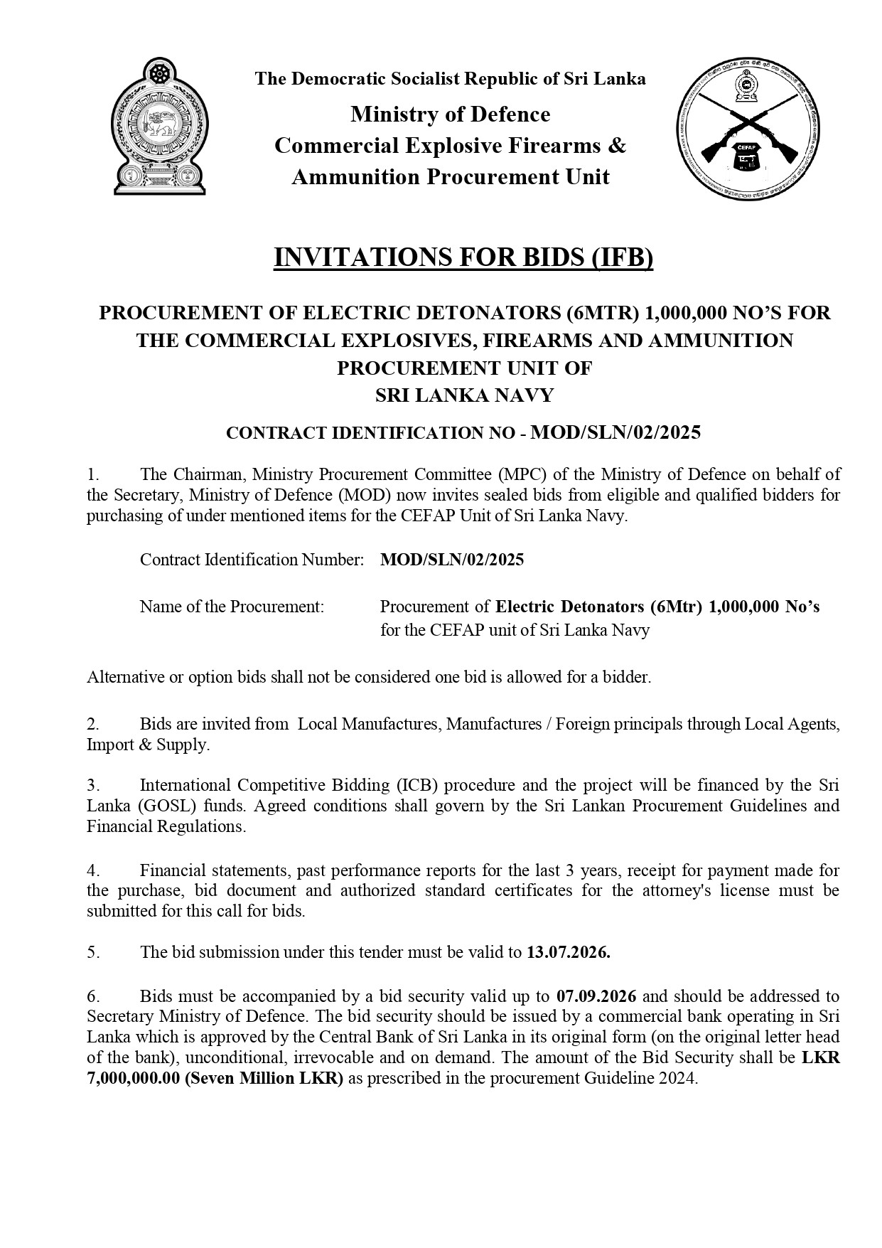 Procurement of Electric Detonators (6mtr) 1,000,000 No’s for the Commercial Explosives, Firearms and Ammunition Procurement of Sri Lanka Navy Contract No: MOD/SLN/02/2025