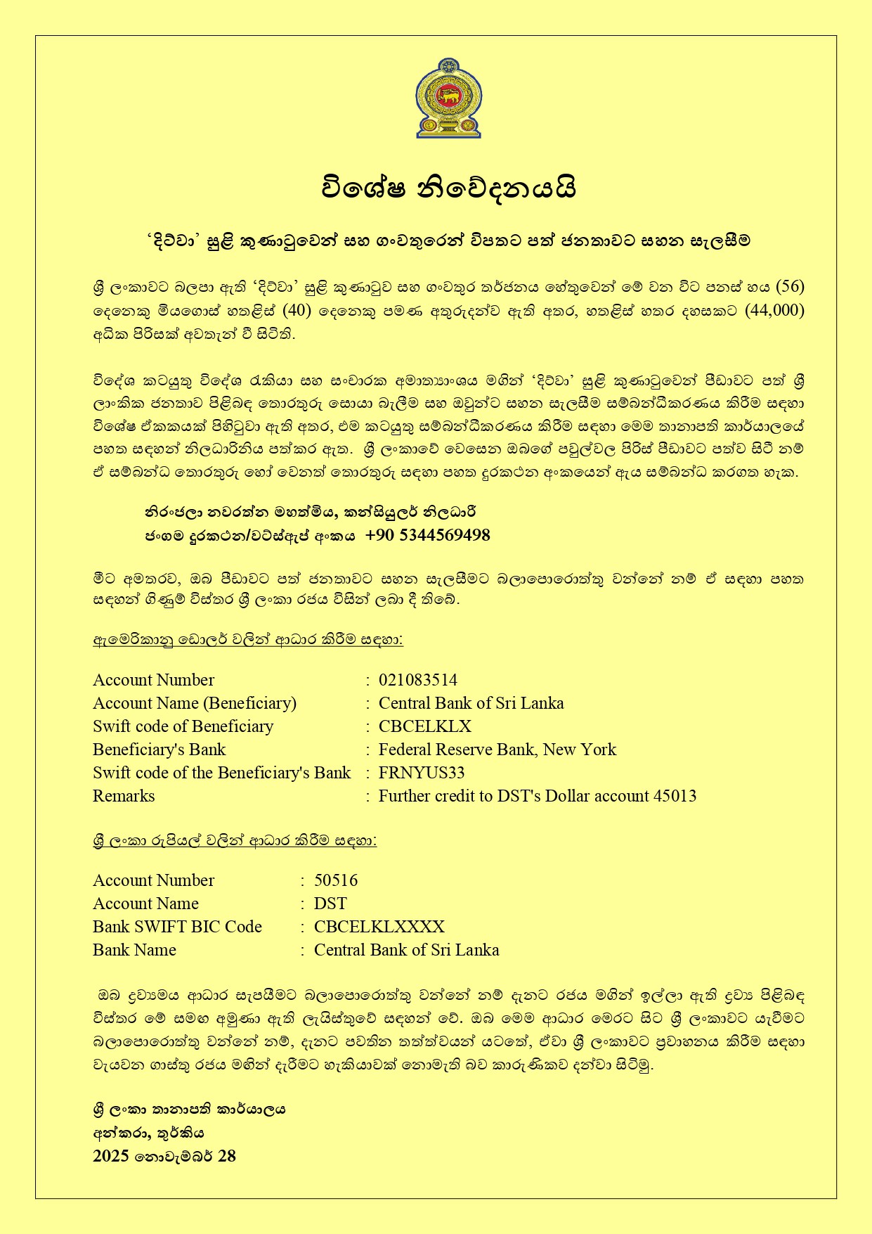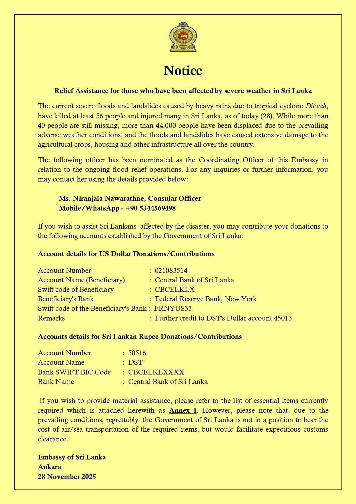 If you wish to assist Sri Lankans affected by the disaster, you may contribute your donations to the following accounts established by the Government of Sri Lanka: