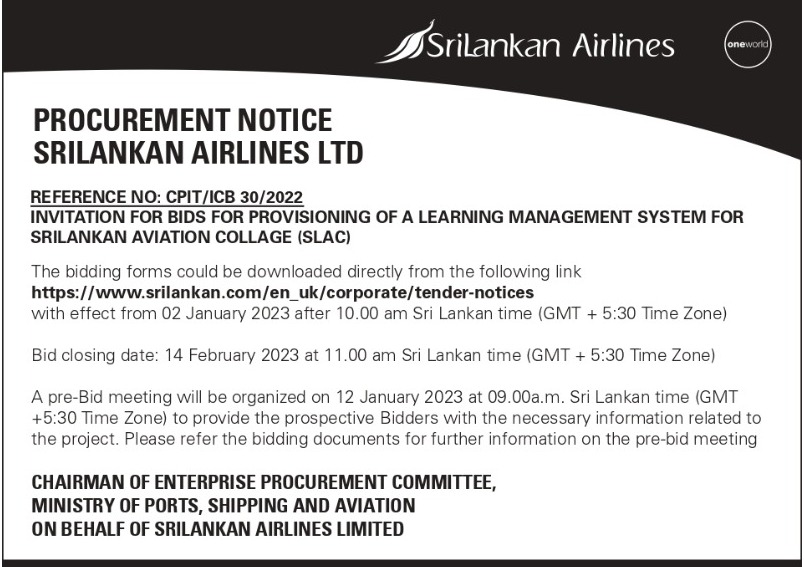 Procurement Notice - SriLankan Airlines Ltd Invitation for Submission of Bids for the Selection of Media Buying and Placement Agencies for Sri Lankan Airlines in Sri Lanka and Overseas