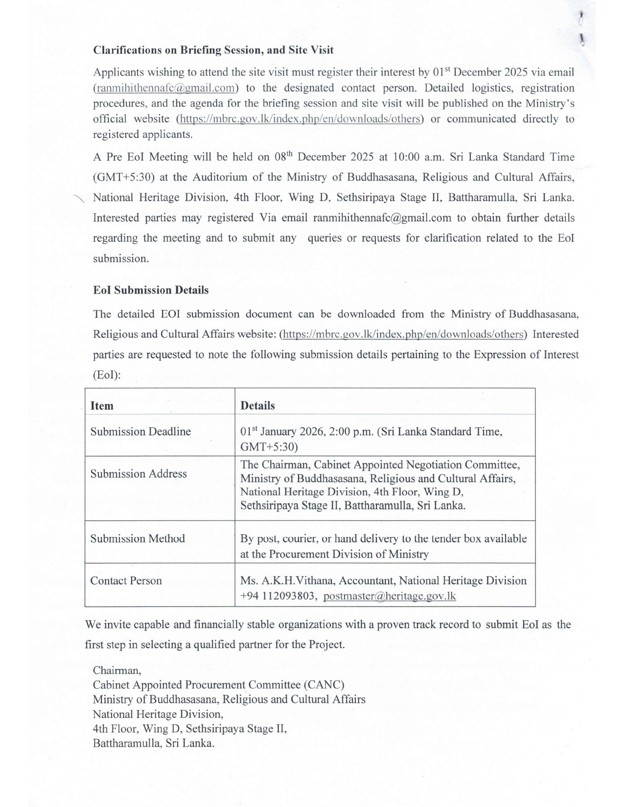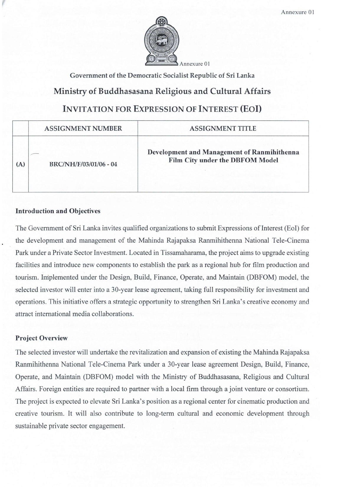 The Government of Sri Lanka invites qualified organizations to submit Expressions of Interest (EOI) for the development and management of the Mahinda Rajapaksa Ranmihithenna National Tele-Cinema Park under a Private Sector Investmen