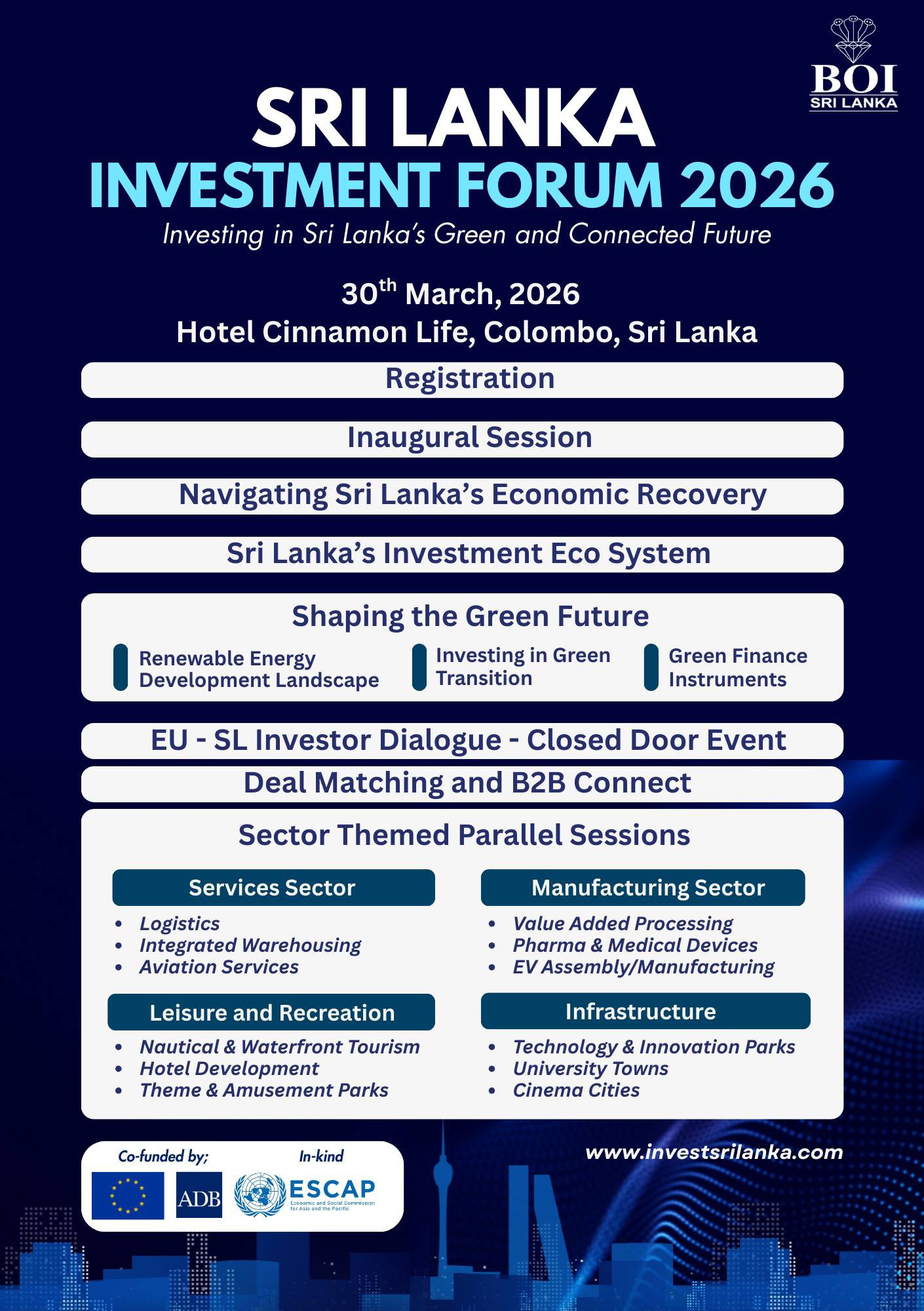 The Board of Investment of Sri Lanka (BOI), in partnership with the European Union (EU), the Asian Development Bank (ADB), and the United Nations Economic and Social Commission for Asia and the Pacific (ESCAP), will be hosting the Sri Lanka Investment Forum on March 30, 2026, in Colombo.